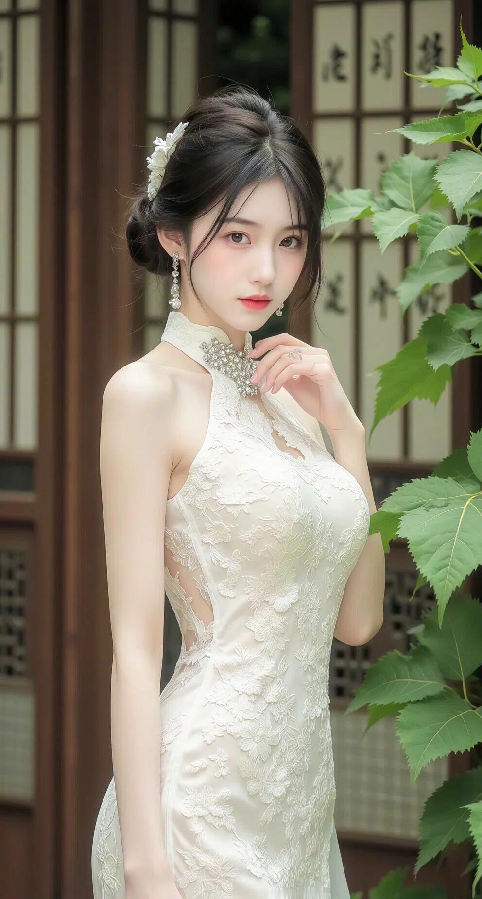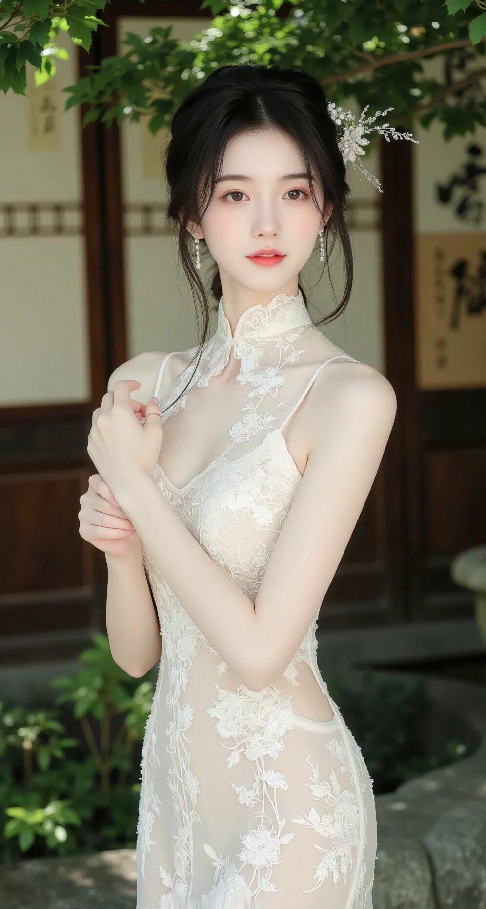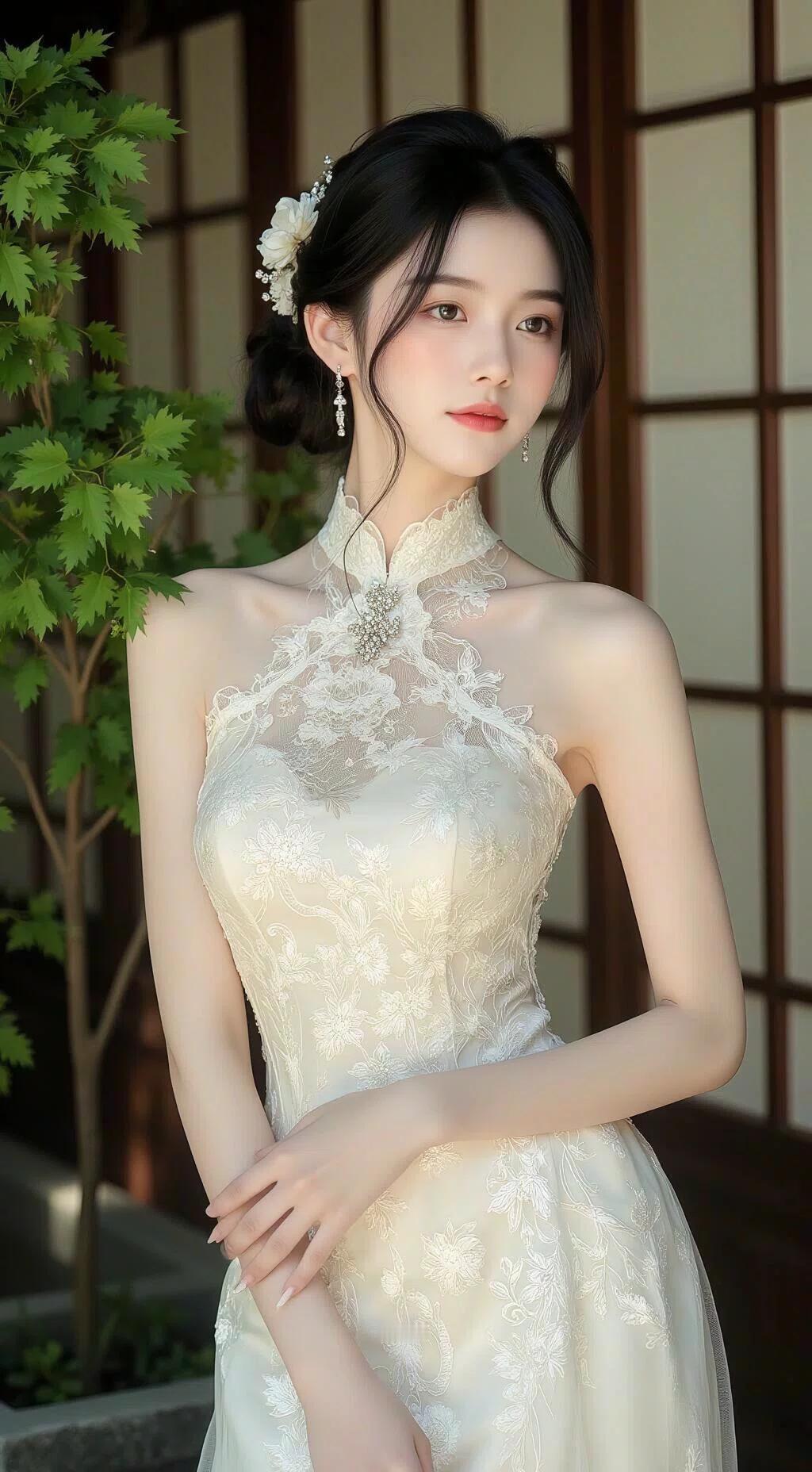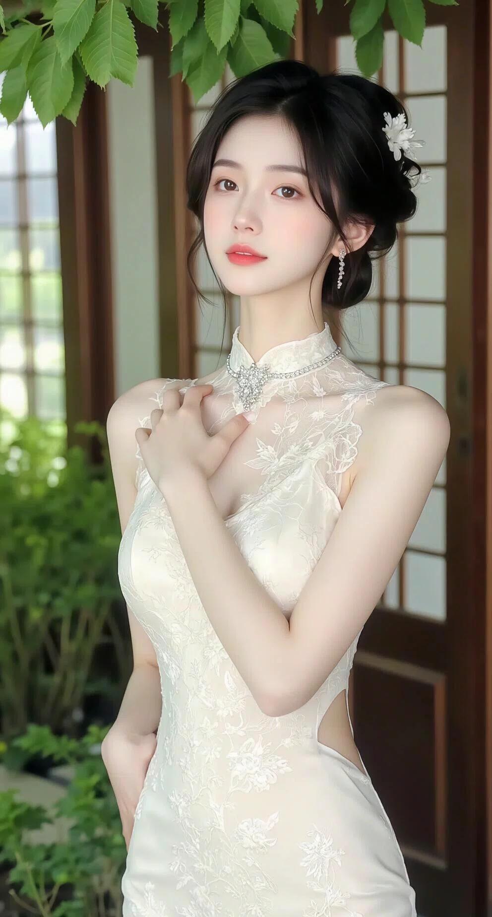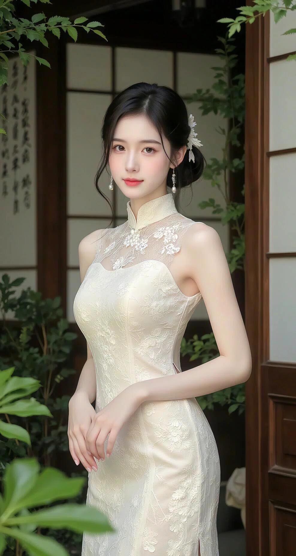 一身奶白色新中式蕾丝刺绣旗袍,每一款都独具韵味:立领盘扣勾勒东方脖颈线条,通透网纱透视、精致花卉蕾丝刺绣、后背小心机镂空、挂脖露肩设计,把温婉身段完美勾勒,缎面面料细腻高级,修身鱼尾版型衬得身姿曼妙,高开叉与轻纱裙摆更添仙气。