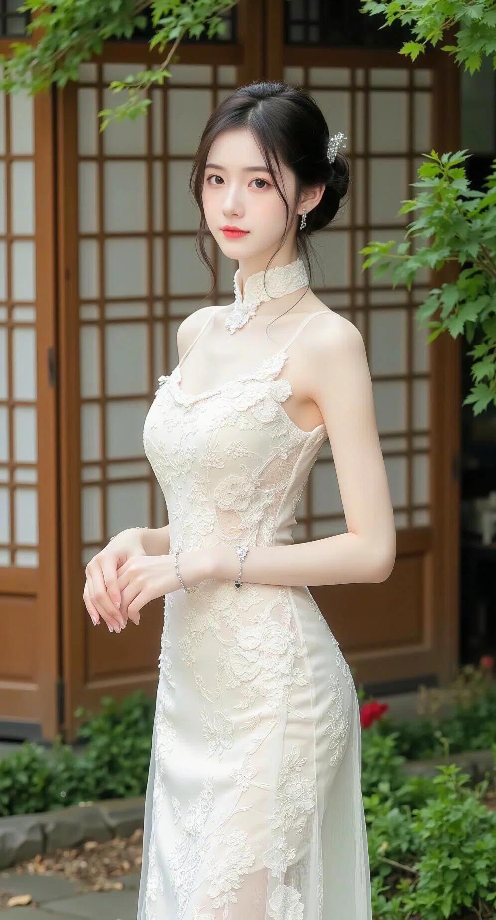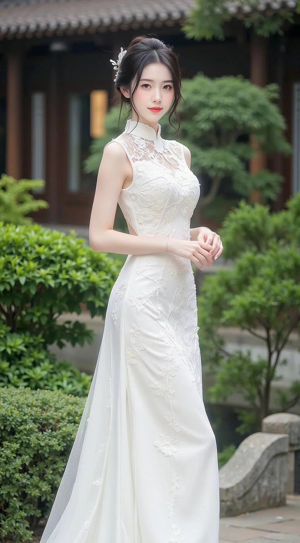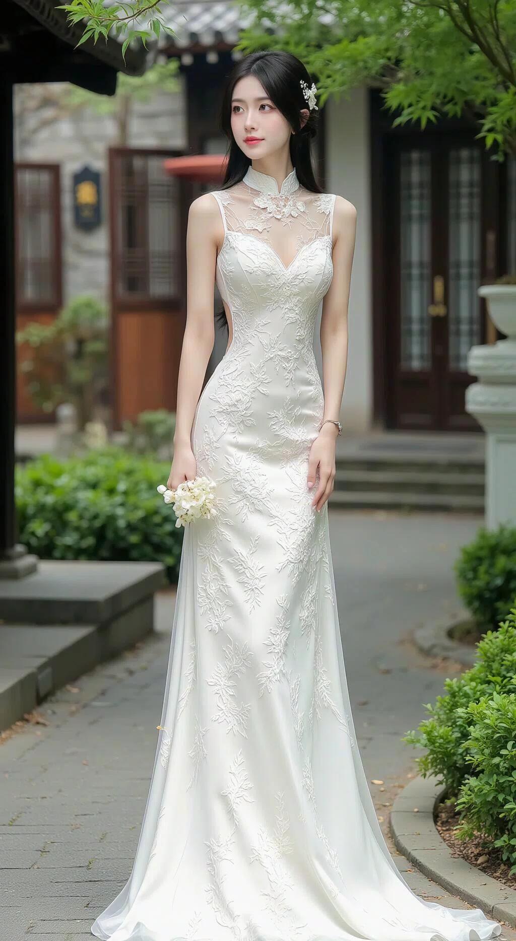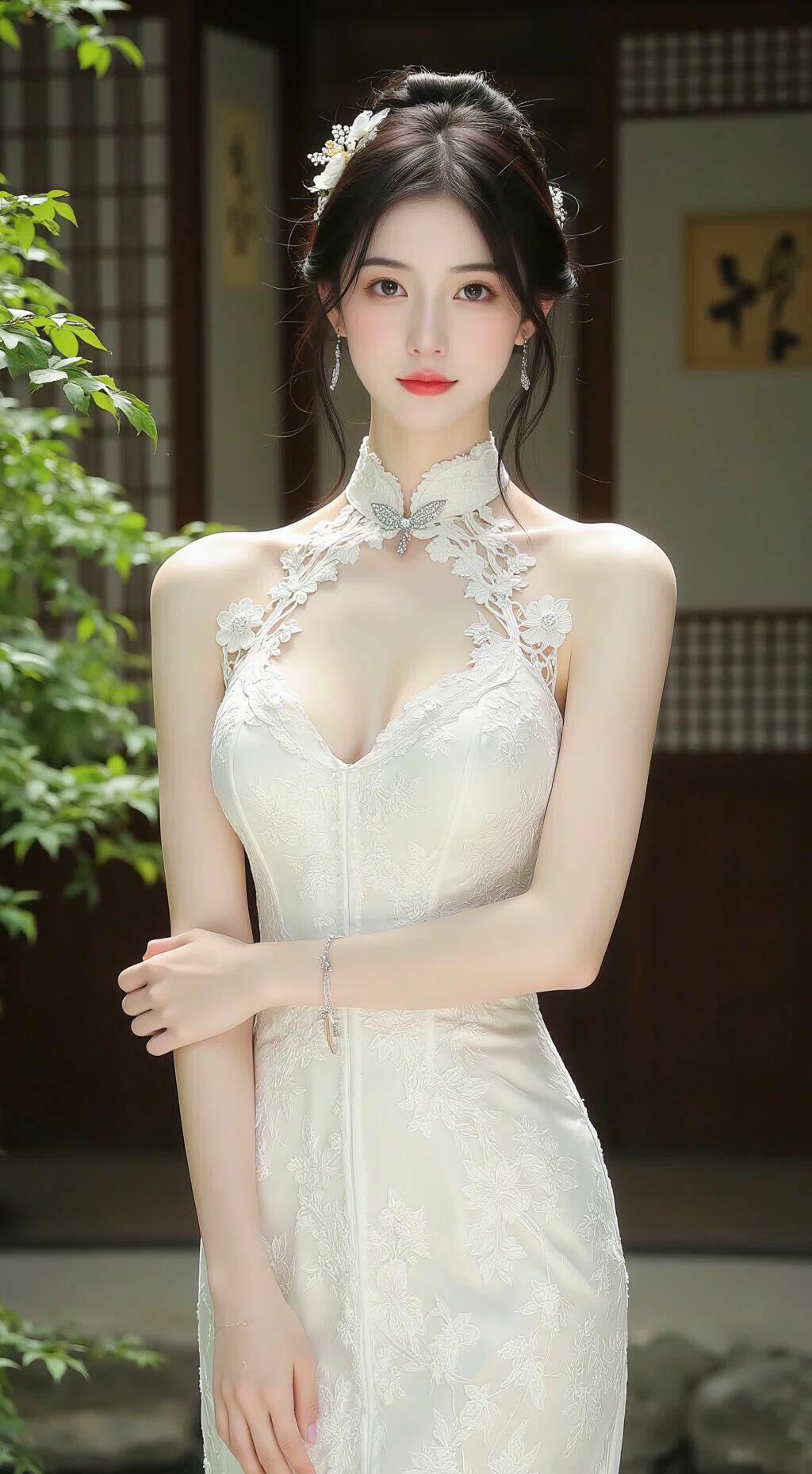 一身奶白色新中式蕾丝刺绣旗袍,每一款都独具韵味:立领盘扣勾勒东方脖颈线条,通透网纱透视、精致花卉蕾丝刺绣、后背小心机镂空、挂脖露肩设计,把温婉身段完美勾勒,缎面面料细腻高级,修身鱼尾版型衬得身姿曼妙,高开叉与轻纱裙摆更添仙气。