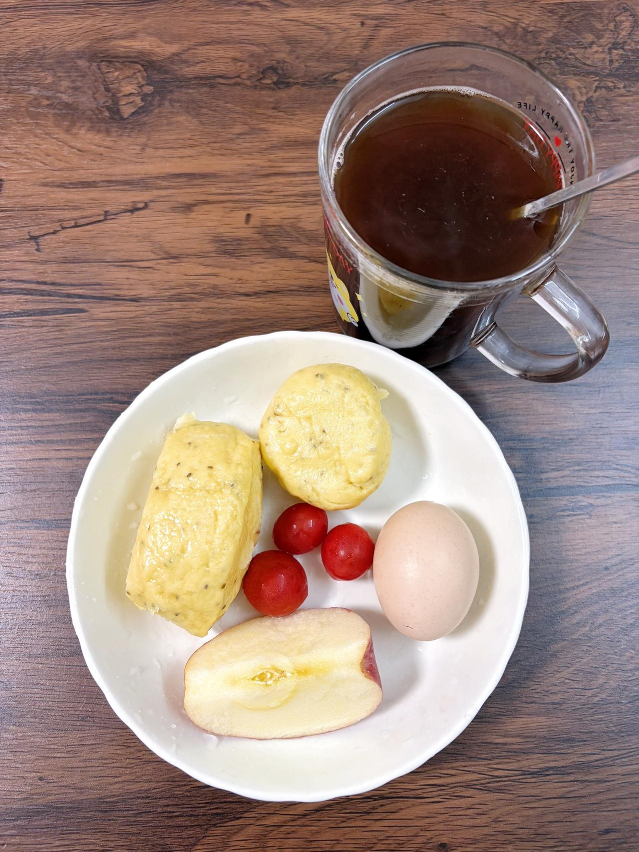今日减脂早餐:玉米馒头+苹果+番茄+鸡蛋+黑咖啡