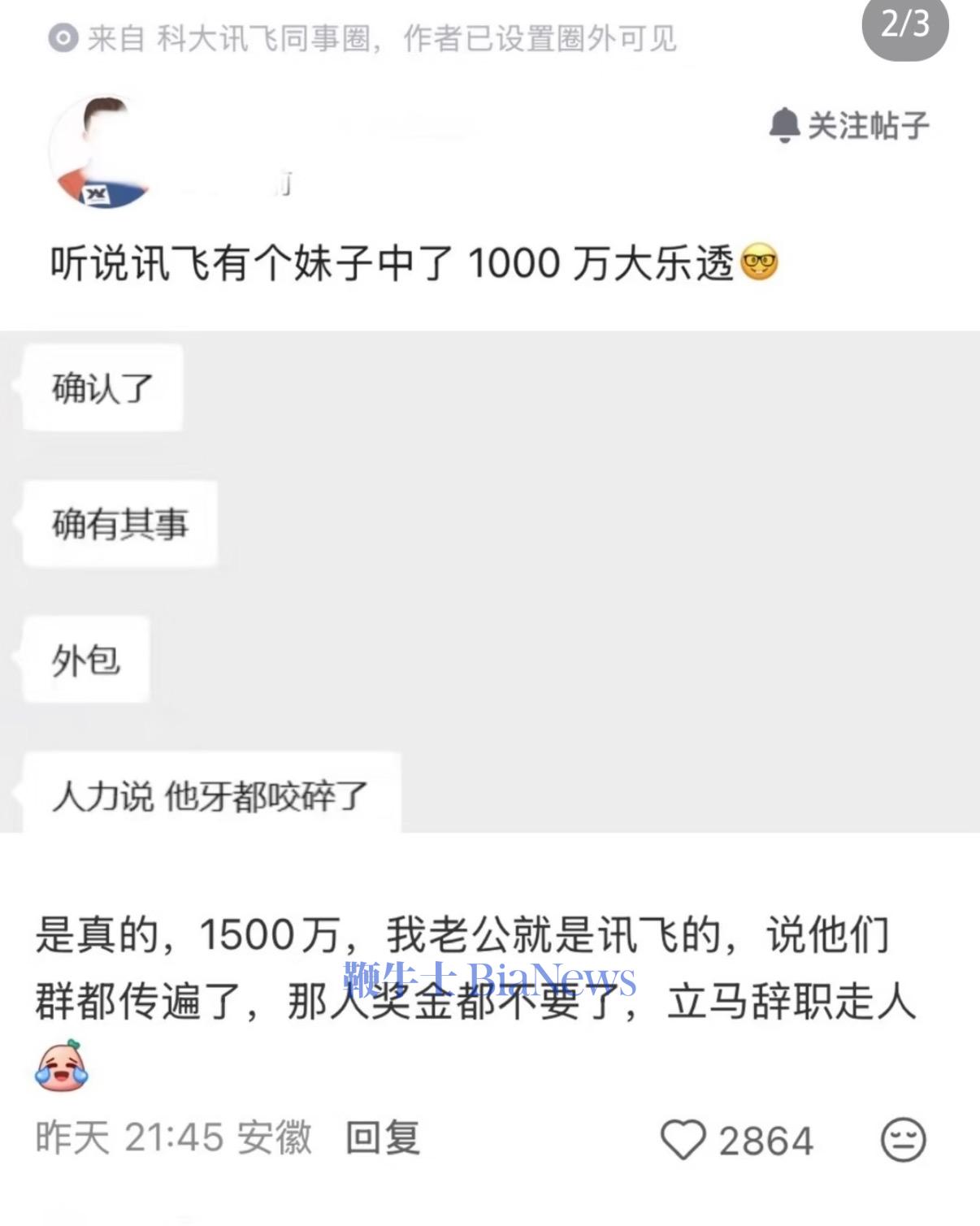 还有评论补充道,“是真的,不过是1500万,我老公就是讯飞的,内部群已经传遍了。中奖人连公司奖金都不要了,立马辞职走人了。”