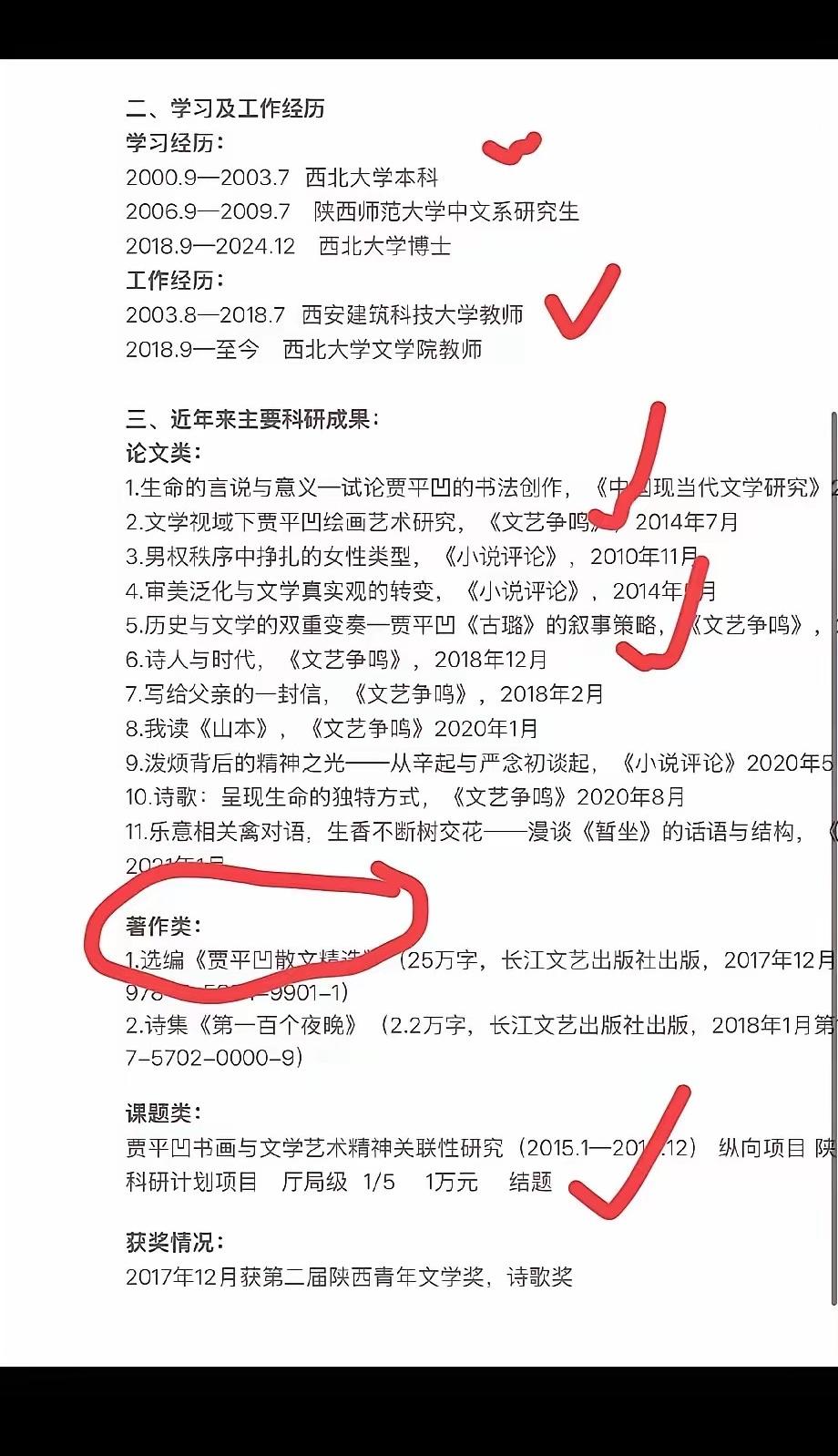 贾浅浅的研究方向也很有意思——集中在她爸贾平凹的作品上。她的本硕博均在陕西高校就读,博士毕业于西北大学,而她的父亲恰好也是该校校友。2018 年从西安建筑科技大学调回西北大学,这段经历看起来就像是画了一个圈。