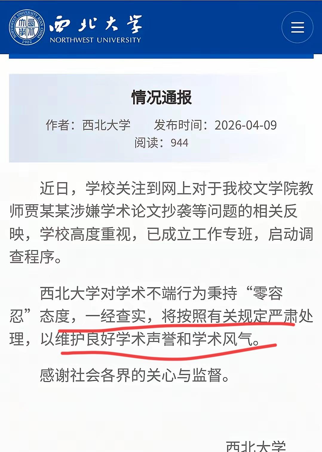 2026年4月9日,西北大学一纸通报把贾浅浅再次推到舆论火山口上。针对通报中提及的该人员学术论文疑似原创性不足问题,校方已按相关规定正式开展调查工作。