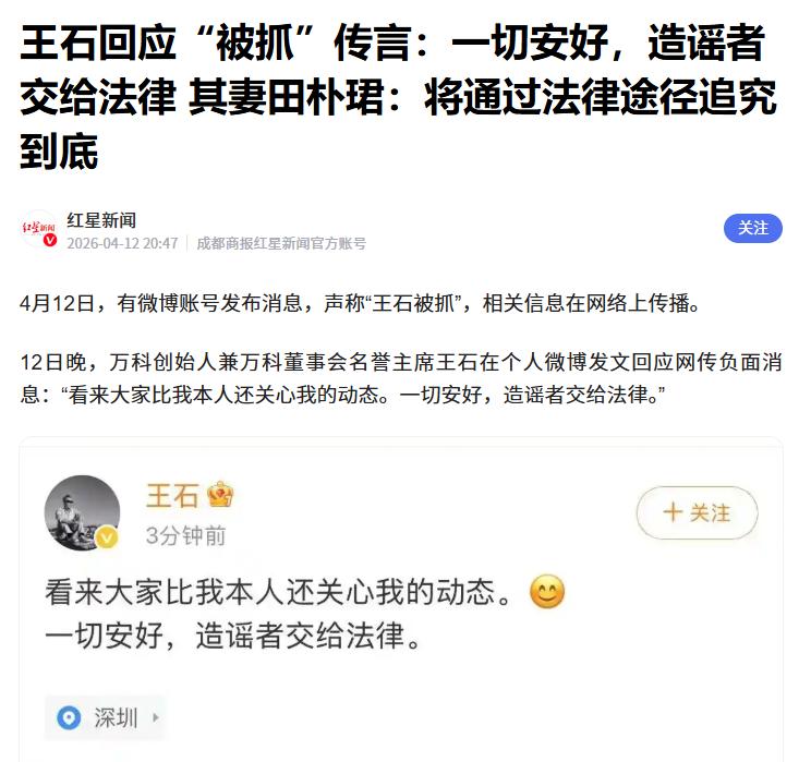 4月12日,“王石被抓”的相关消息在互联网上流传,引发网友关注。