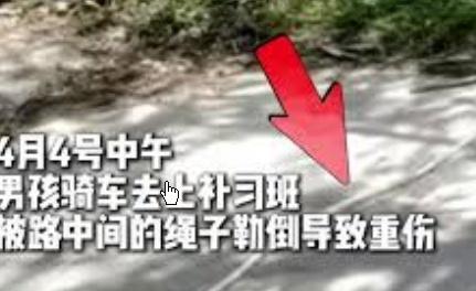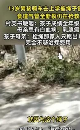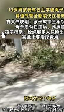 13岁男孩骑车上学遭绳子锁喉 4月11日,据报道,河南省焦作县某村,一名老人在收割玉米时,非法将绳子绑在村道上。一名13岁男孩骑自行车上学途中,被绳子缠住脖子,瞬间窒息而亡。他忍着剧痛,托着头跑回家。