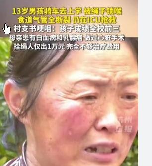 13岁男孩骑车上学遭绳子锁喉,我们不知道他能不能活下来。我太绝望了!我的心都碎了!”男孩的一位家人绝望地说道。