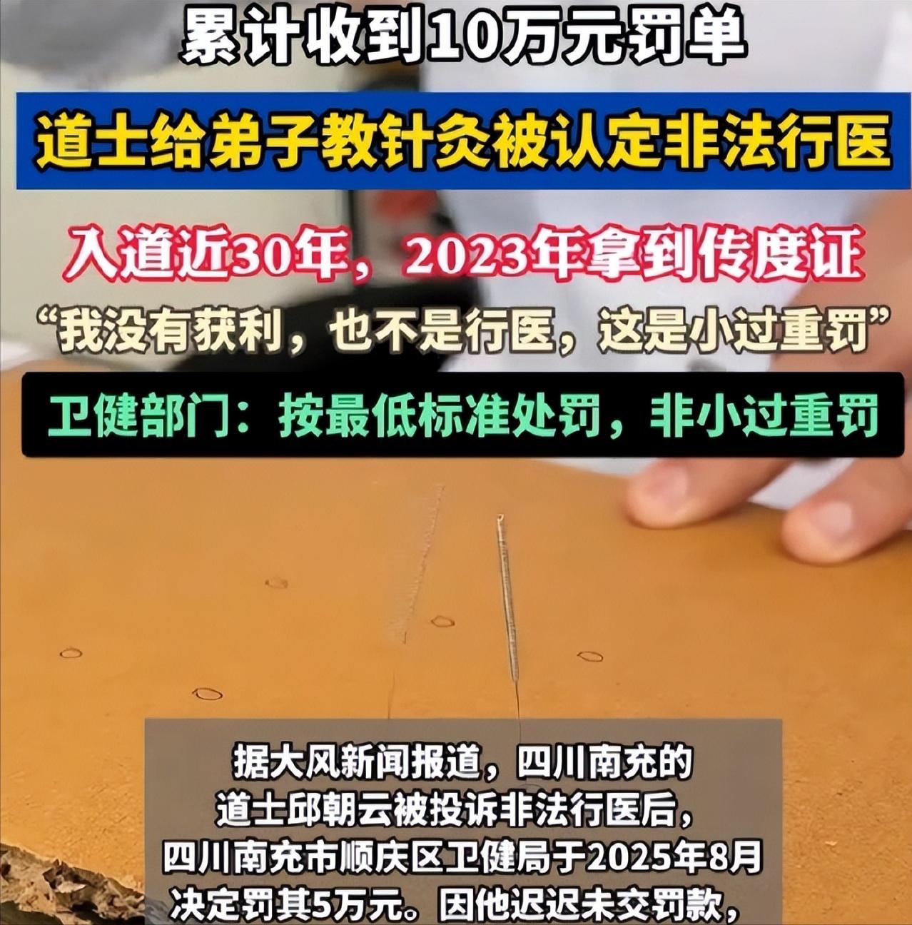 参考信息:凤凰网.(2026年4月10日).道士给弟子教针灸被认定非法行医,累计收到10万罚单,卫健局:已是最低处罚.