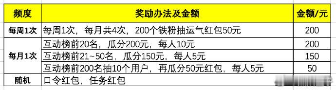 奖励办法与金额:①每周至少1次,单月共计4次→每周五晚,抽200铁粉随机分50元现金红包(拼手气)②3月互动榜前20名,瓜分200元,每人10元③3月互动榜前21~50名,瓜分150元,每人5元