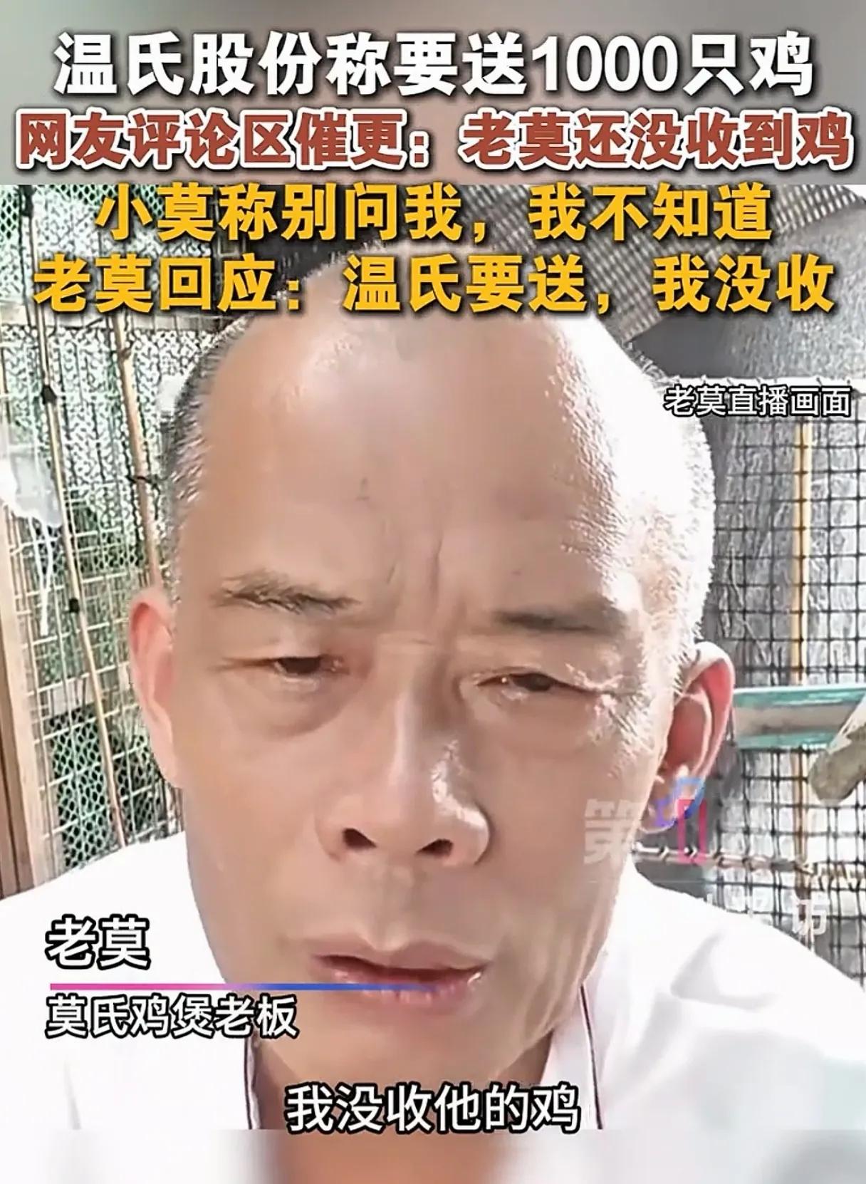 老莫门店一直用的是村民散养土鸡,饲养周期6-7个月,温氏105天工业化养殖的鸡未必符合食材要求,但既然说了要送,就不应该食言,网友们都瞪大眼睛看着呢?