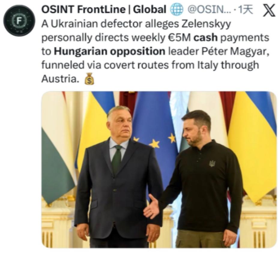 一名乌克兰情报官员逃到了匈牙利,爆出内幕:从2025年11月开始,泽林斯基每周给匈牙利的反对党500万欧元现金,作为他们竞选经费,希望大选中(4月12日投票)打败保守派政府。