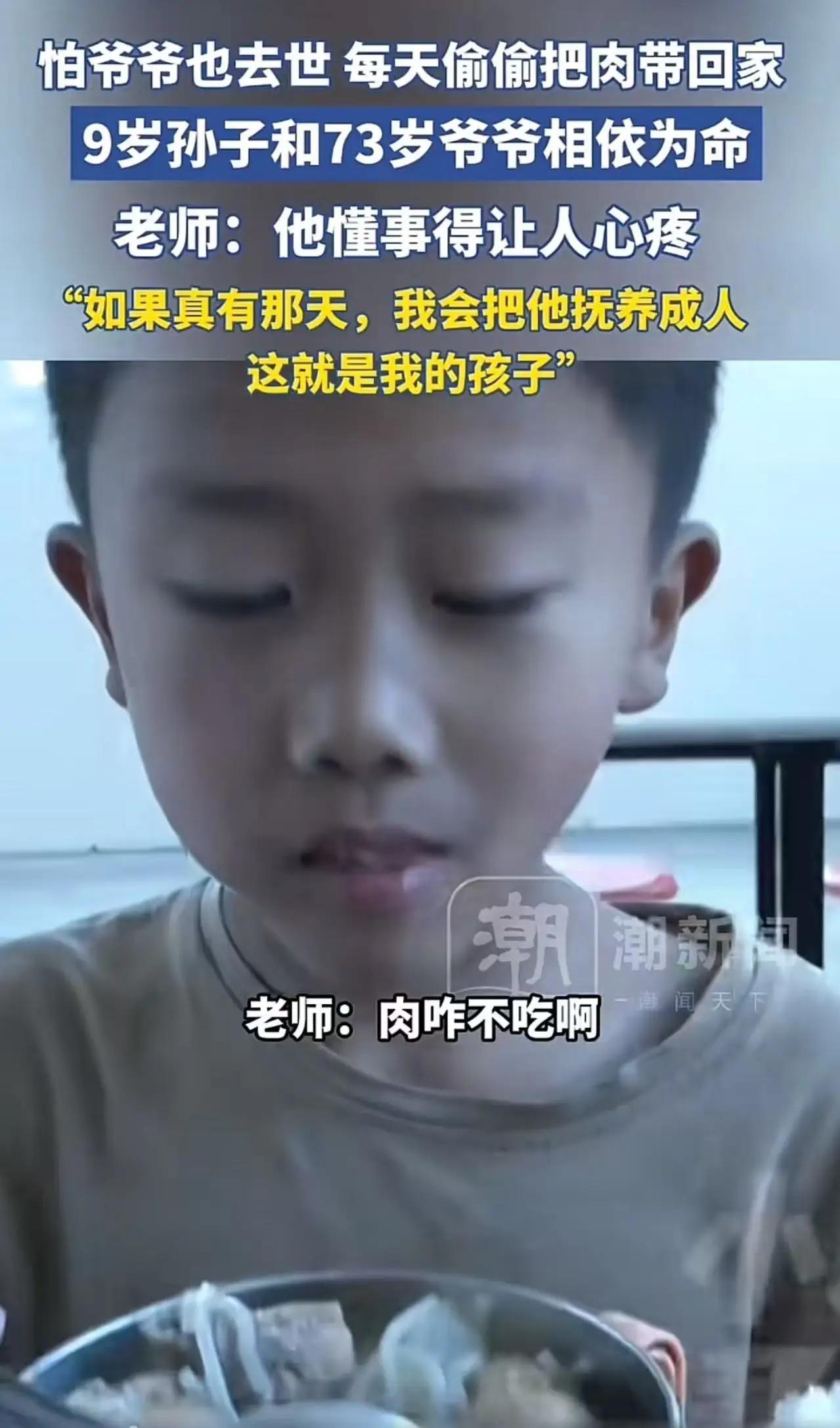 看哭全网!9岁男孩每天偷偷把肉打包带回去。老师发现后问他为什么不吃?没想到孩子说:“爸爸去世了,妈妈改嫁了,奶奶也去世了,我怕爷爷也没了,所以把肉带回去给爷爷吃……”老师:“他懂事的令人心疼,如果真有那天,我会把他抚养成人,这就是我的孩子!”