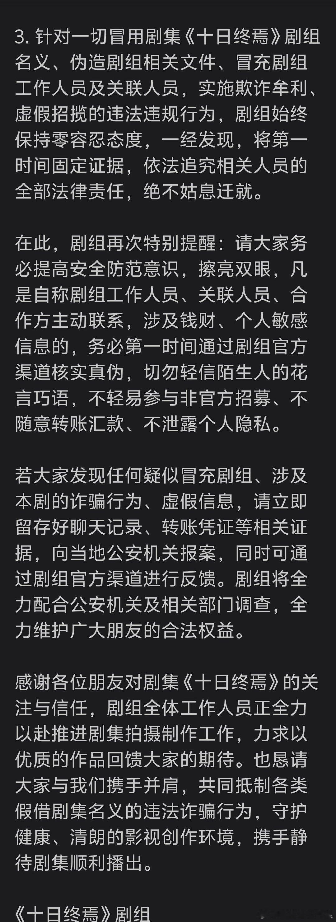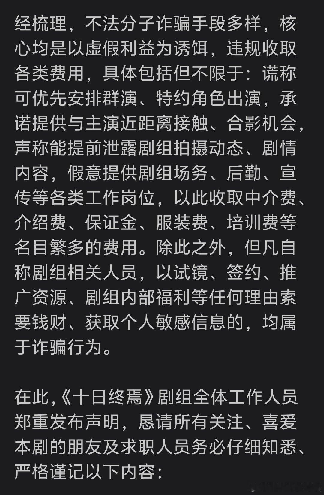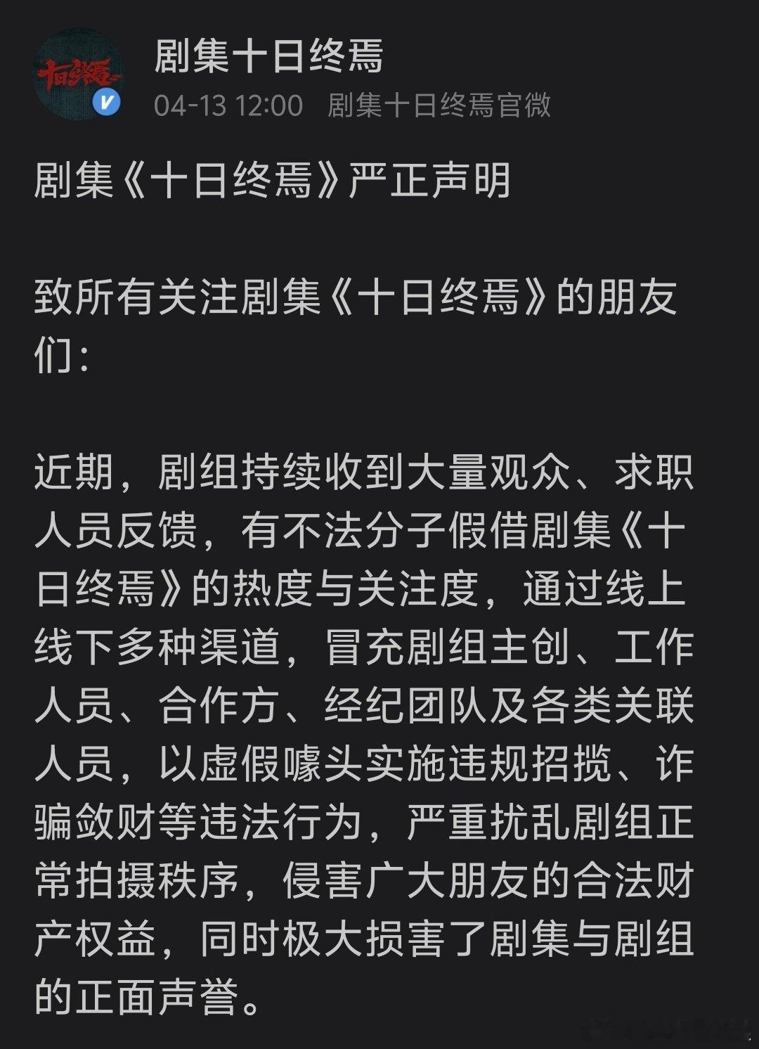 肖战《十日终焉》剧组发长声明,共同抵制各种借剧集名义的违法诈骗行为。