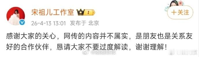 宋祖儿方回应恋情争议 宋祖儿工作室回应恋情争议,说明双方是朋友也是合作伙伴,恳请大家勿过度解读。 宋祖儿工作室回应恋情