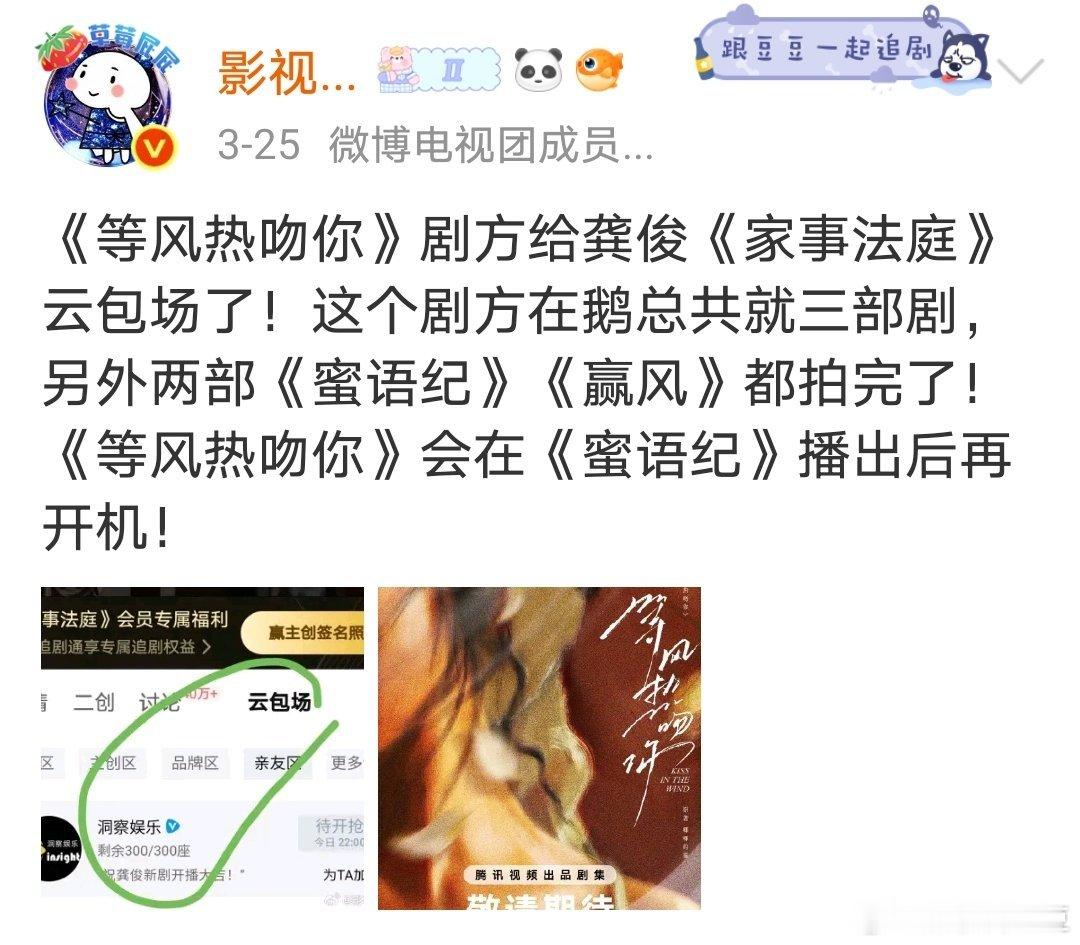 龚俊给《等风热吻你》剧方新剧《蜜语纪》开播云包场了500座,上次这个剧方给龚俊《家事法庭》云包场了300座