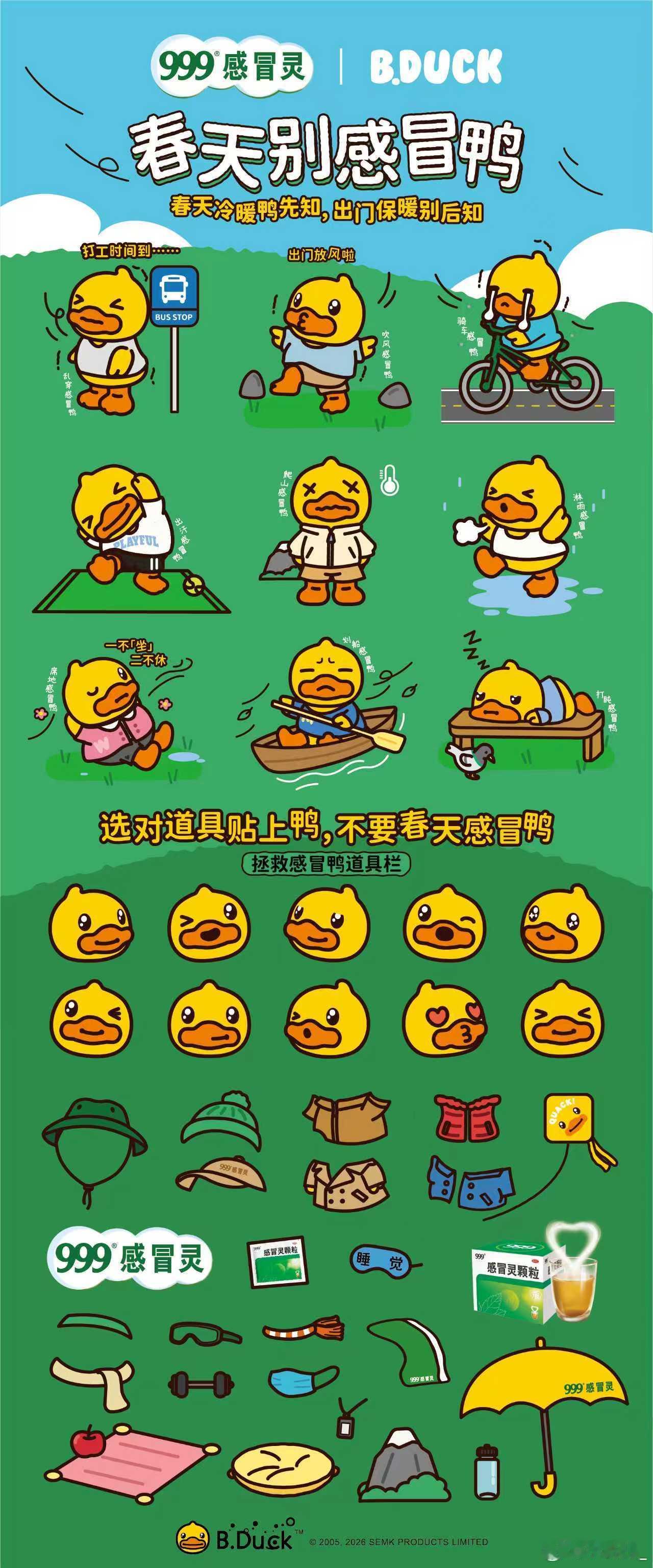 没有一只鸭子逃得过上海春天谁能拒绝软萌小黄鸭!999感冒灵这次联名贴纸也太灵了,换上可爱换装贴纸,一边玩一边记住春季防感冒小知识,守护你稳稳度过上海春天。