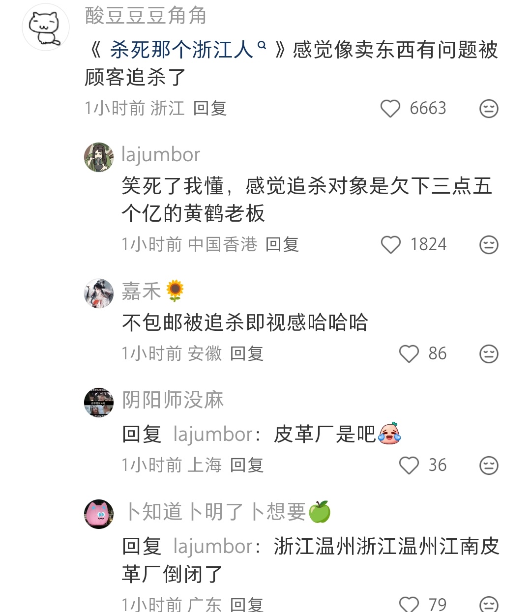 哈哈哈这个贴太好笑了鲨丝那个浙江人感觉像是卖的东西有问题被顾客追鲨了