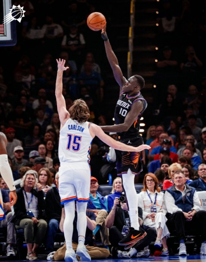 太阳这边,布耶发挥出色,首发出场40分钟,23投12中,三分球8中3,得到27分5篮板9助攻2盖帽,也有4次失误,正负值+37全队最高。布雷亚手感火热,出战28分钟,11投7中,其中三分球9投6中,得到20分5篮板3助攻。邓恩同样非常高效,首发出场25分钟,11投8中,三分球3中2,得到20分11篮板5助攻。
