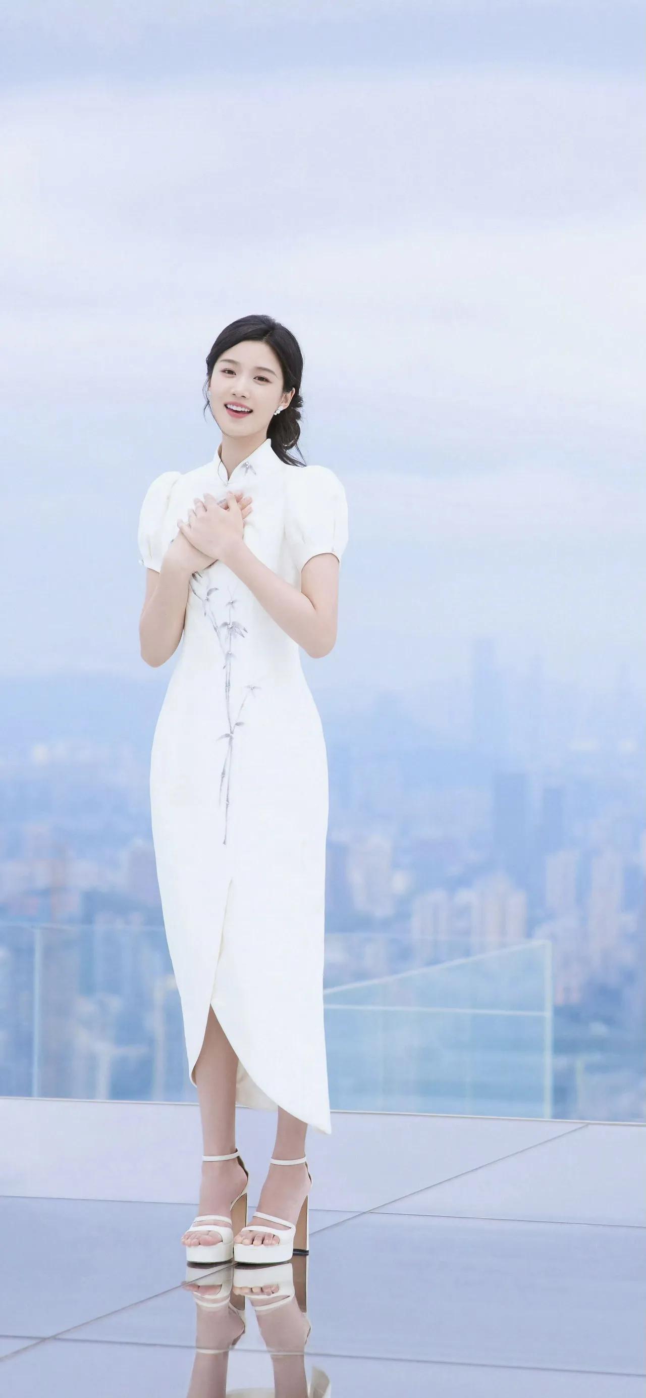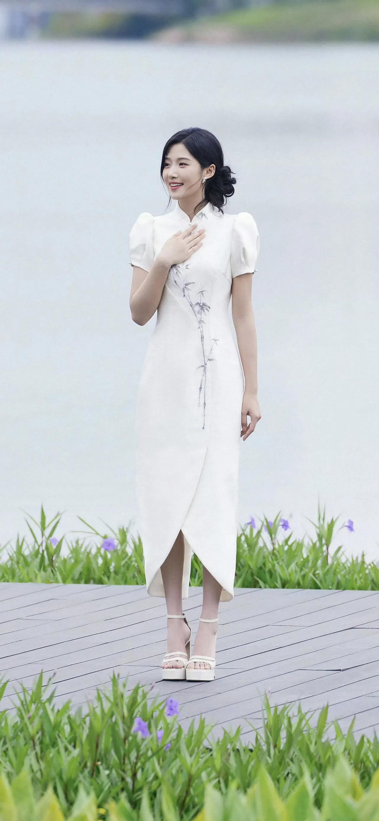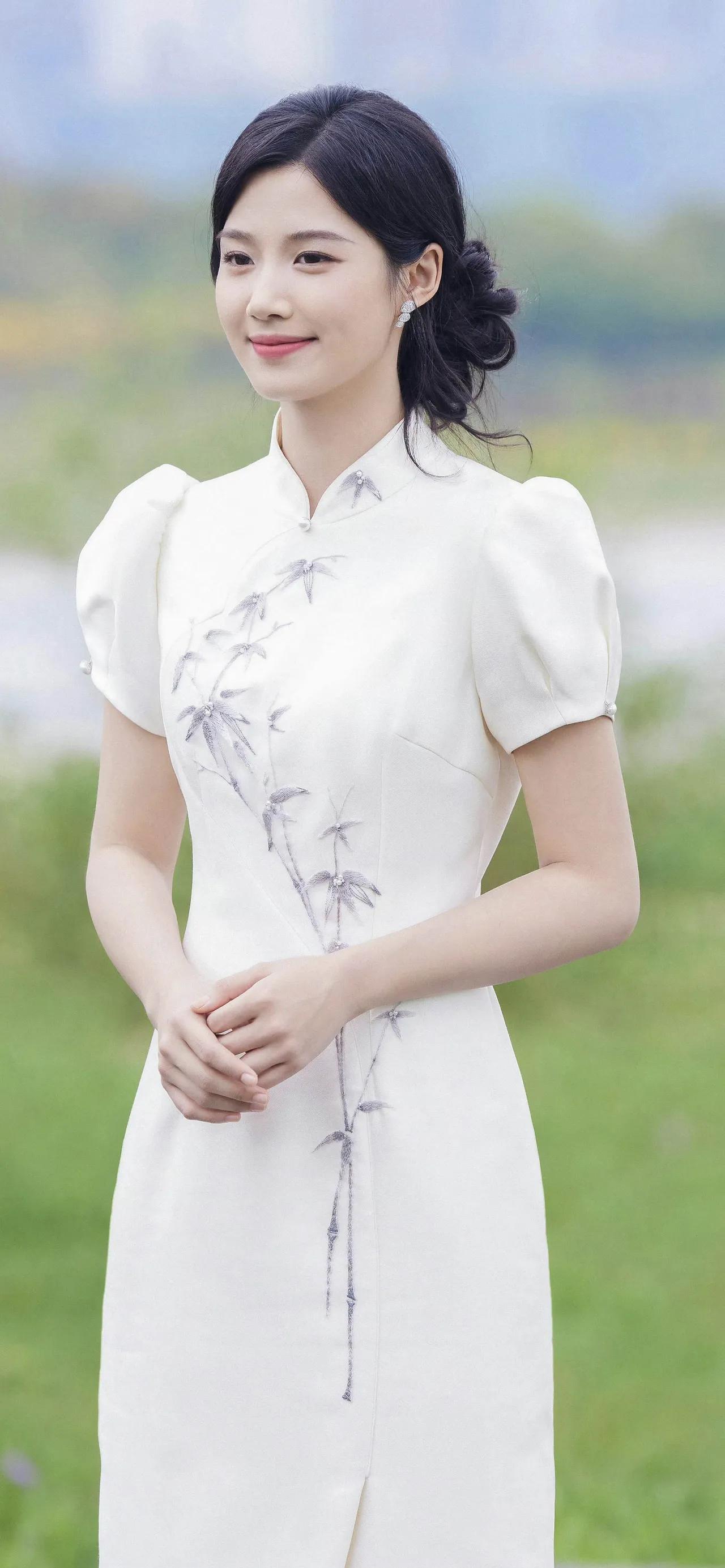 美女壁纸~卢昱晓,一袭月白旗袍,立领温婉,竹影纹样清雅如画。盘发优雅,笑靥温柔,