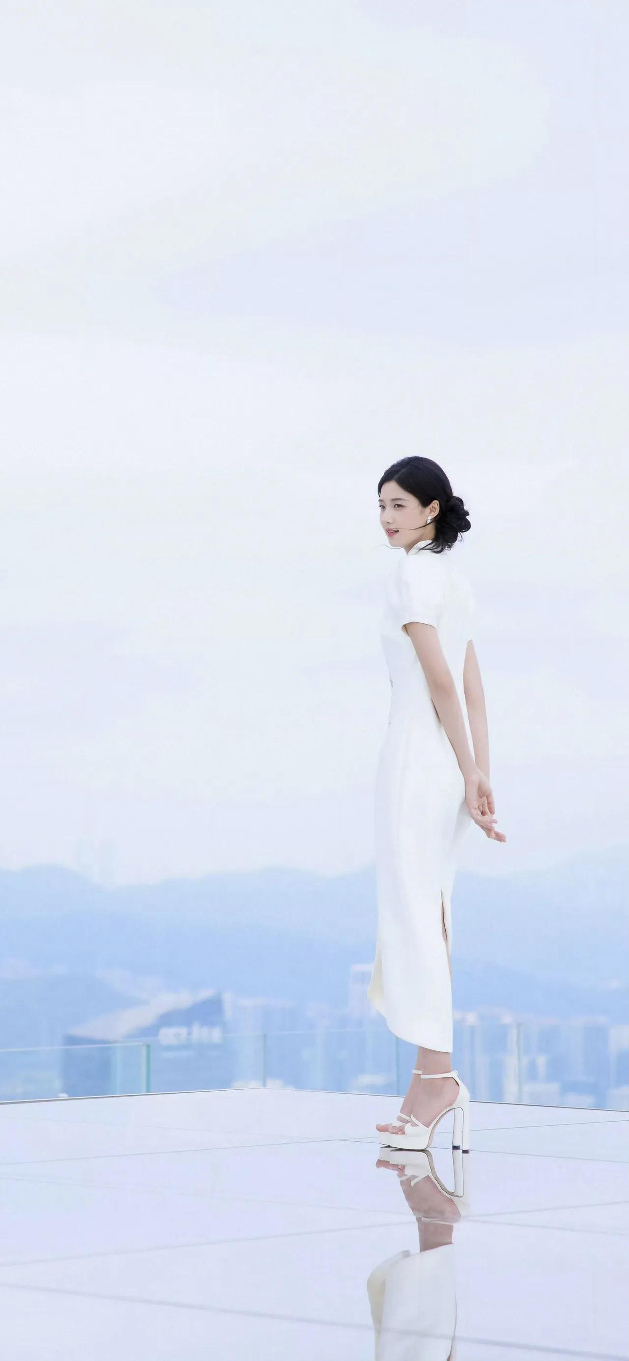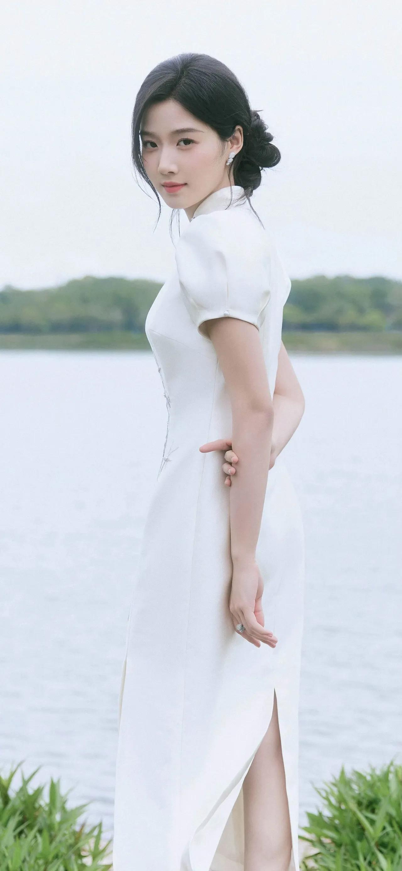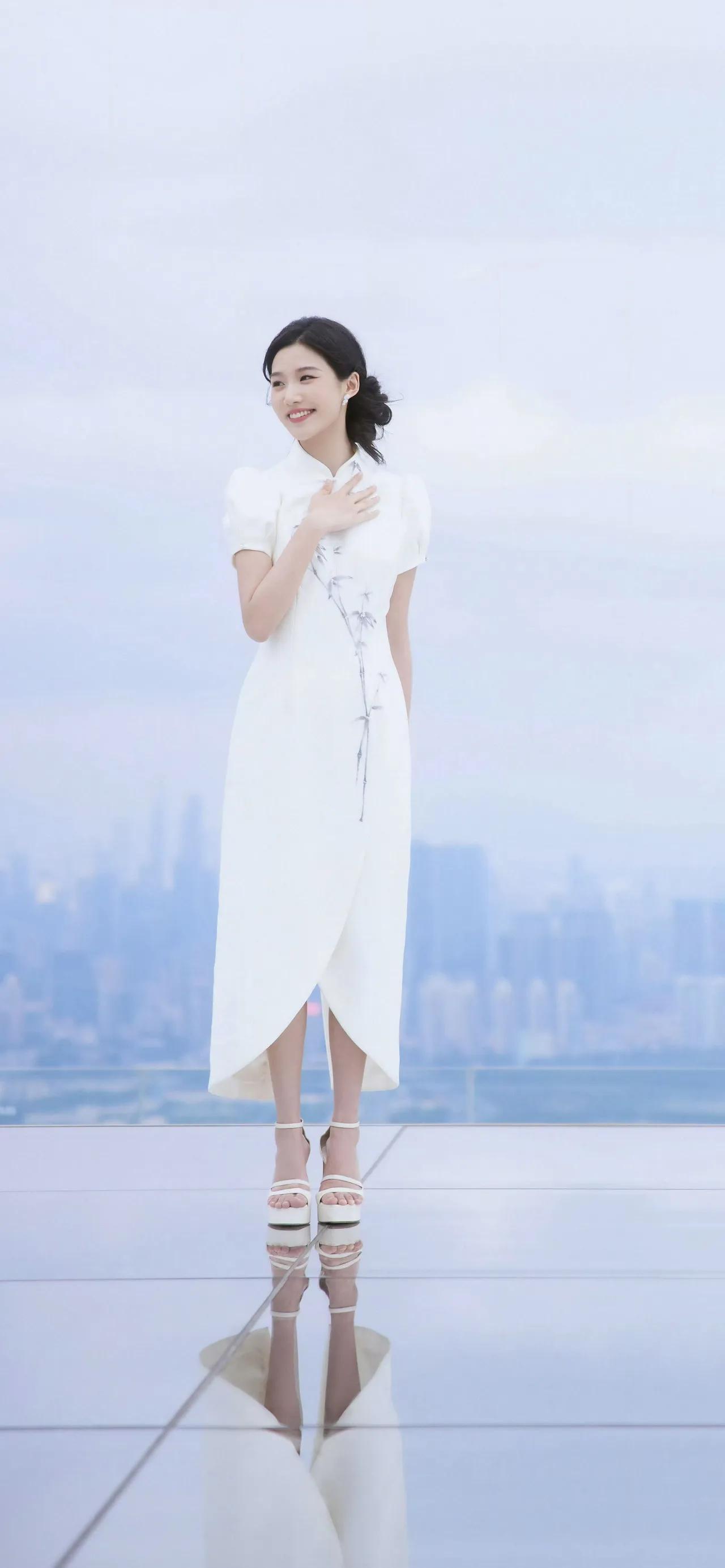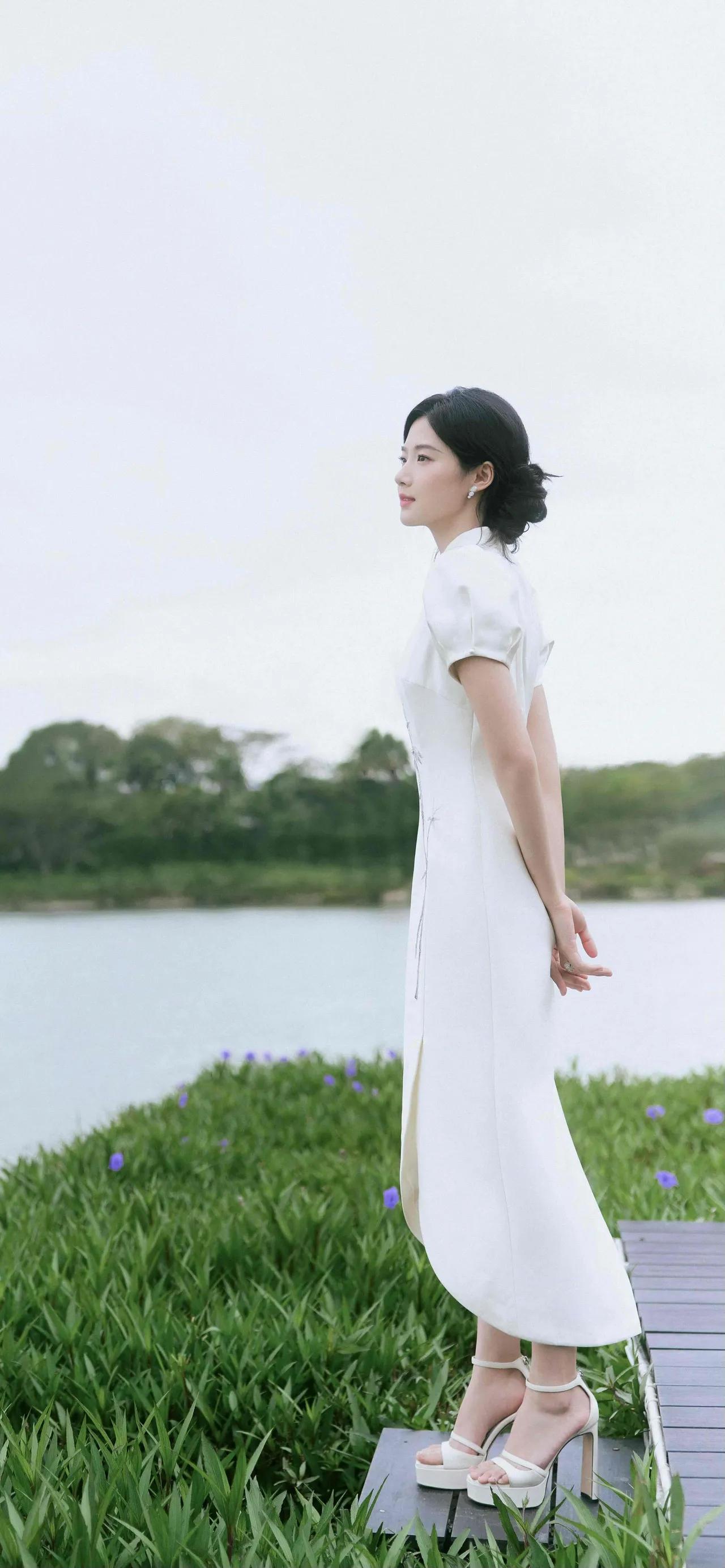 美女壁纸~卢昱晓,一袭月白旗袍,立领温婉,竹影纹样清雅如画。盘发优雅,笑靥温柔,