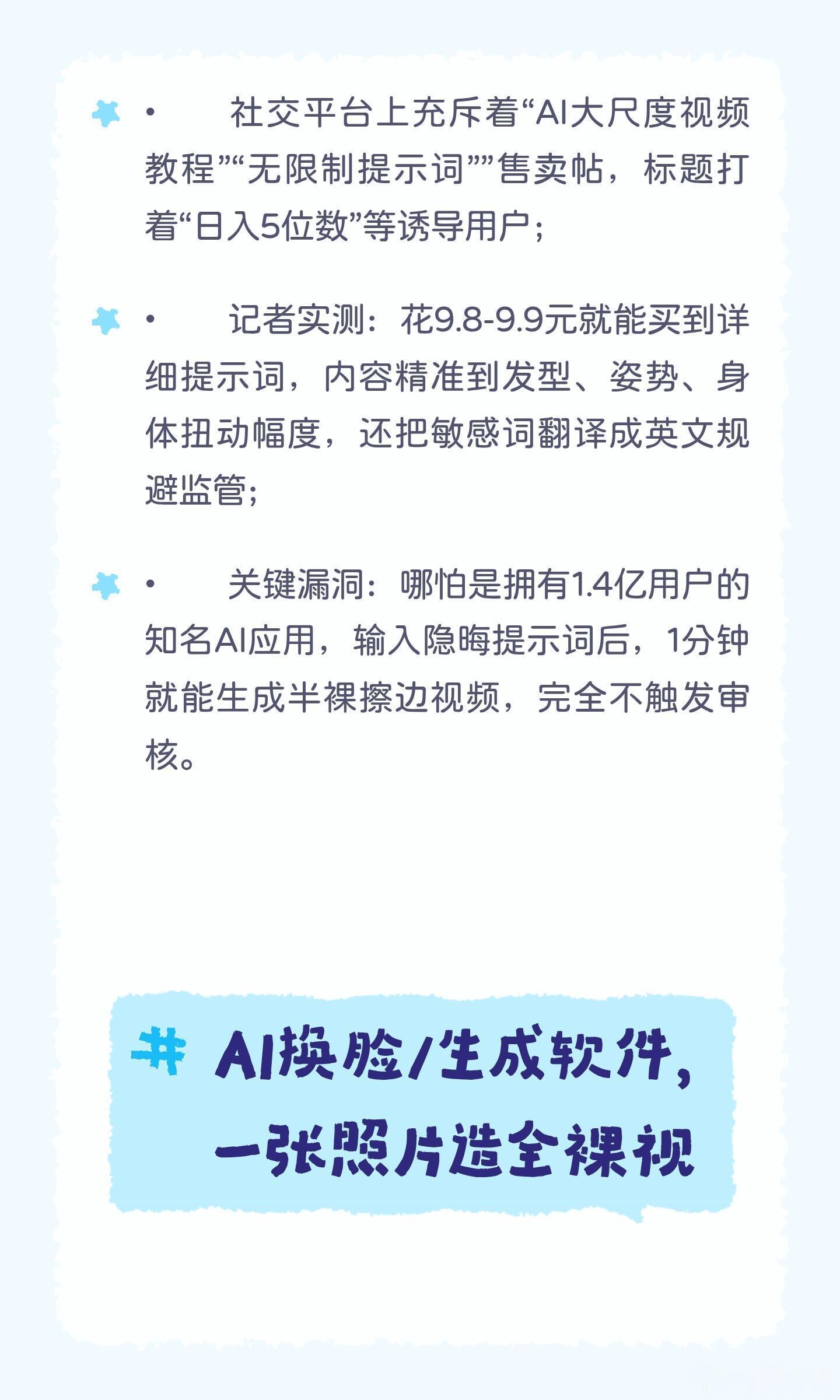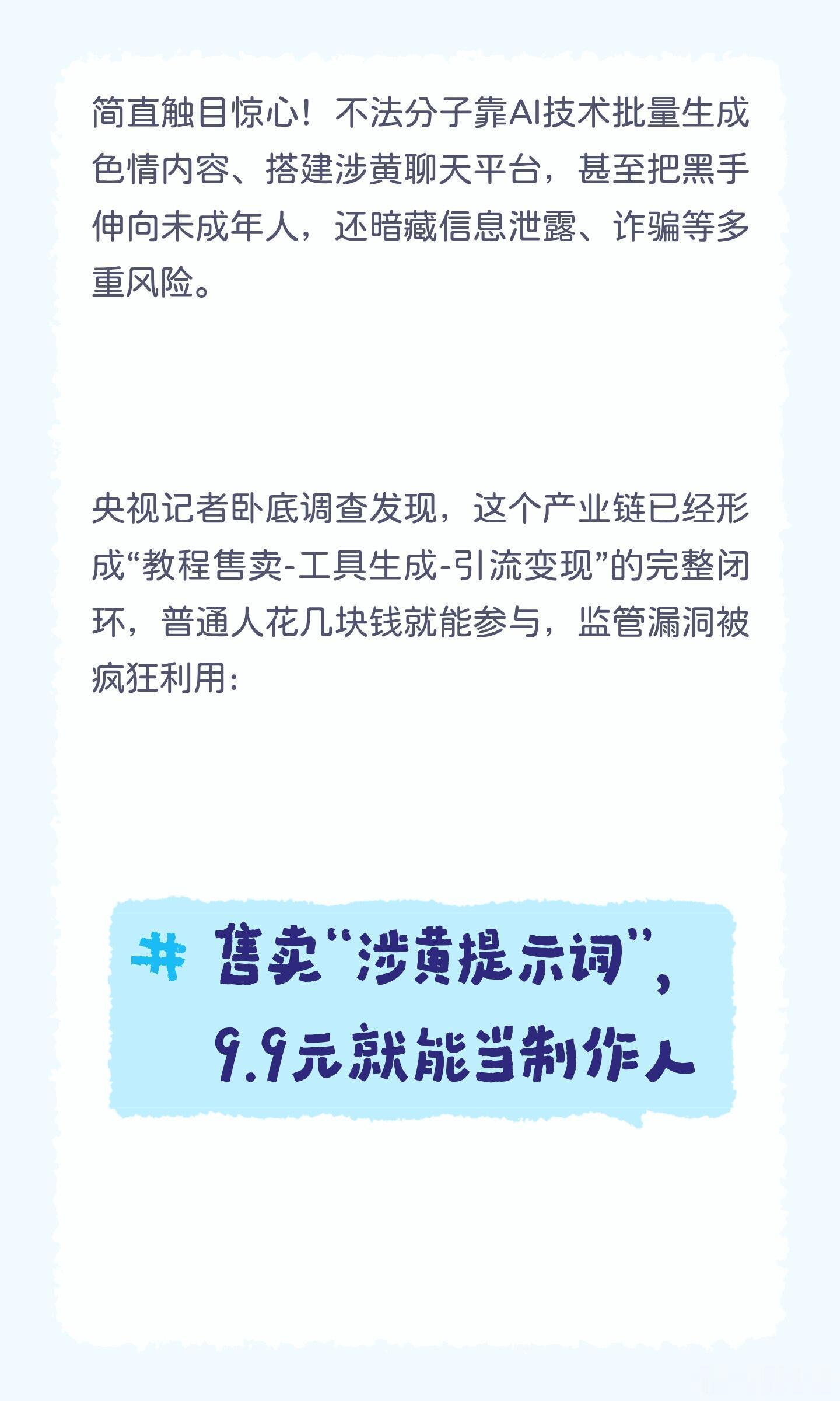 不法商家以9.9元低价兜售"AI造黄教程"及敏感词提示词包,通过翻译敏感词为英文、本地离线部署等方式规避审核,指导用户批量生成色情内容。多方资本领投涉黄ai软件