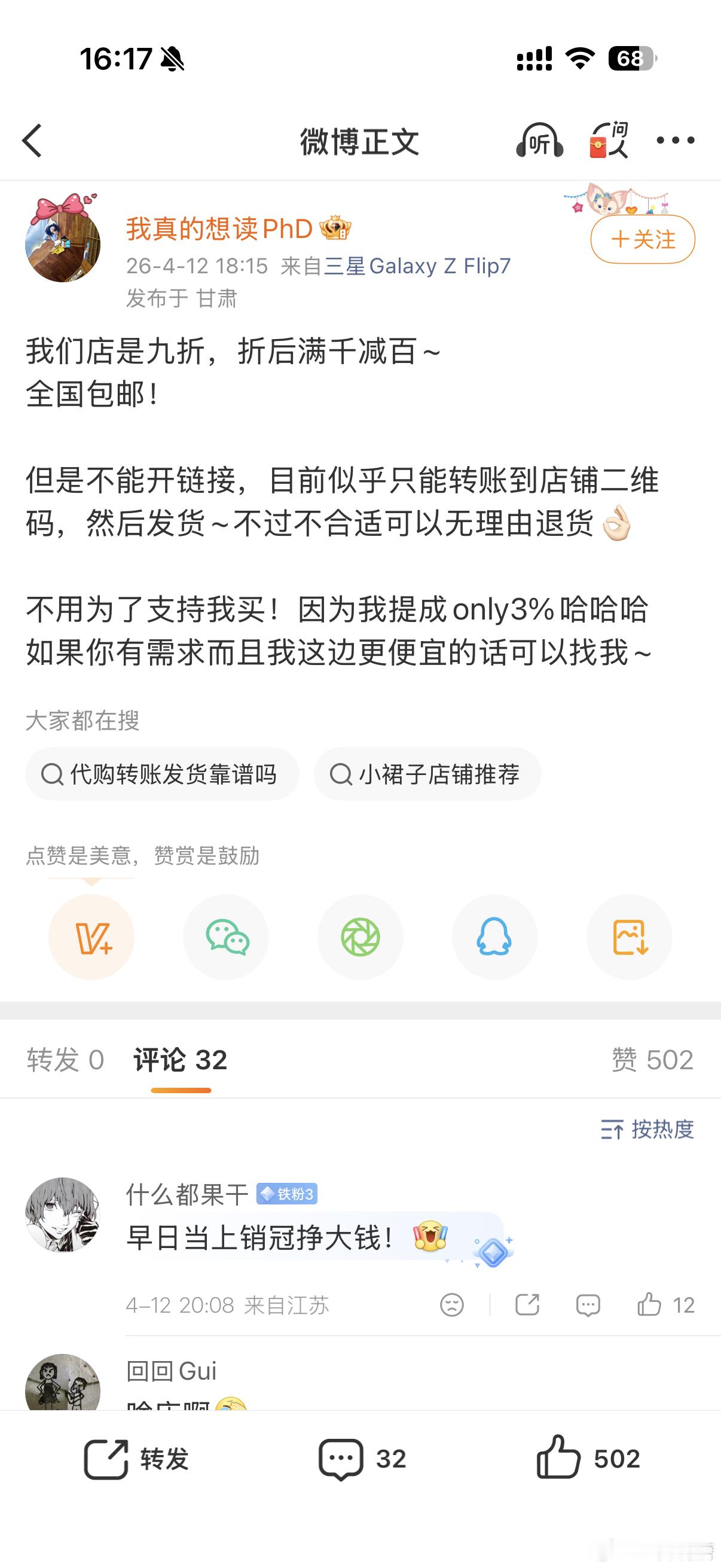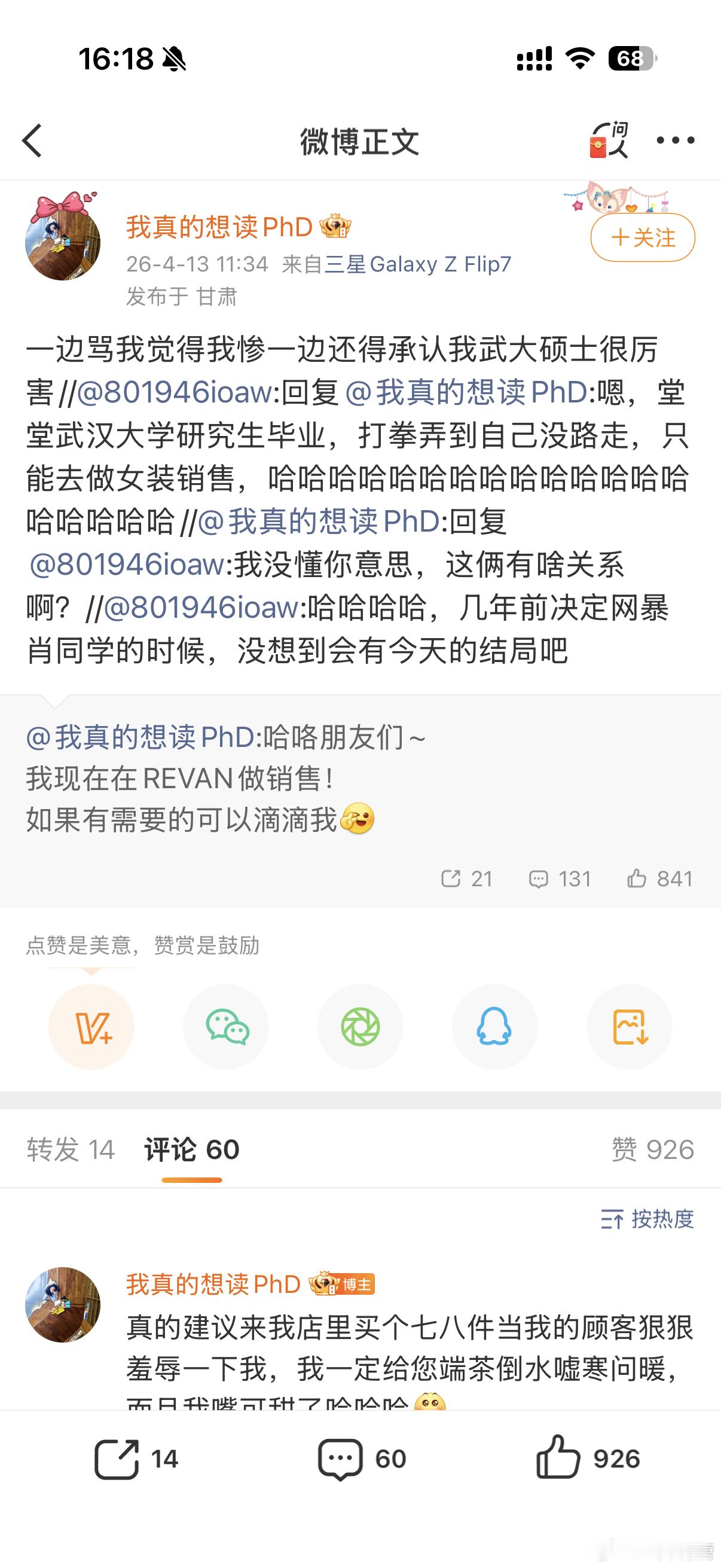 杨同学微博说去REVAN当销售了,武大硕士就业环境也不太好啊。不过愿意自己出来工作自食其力也值得鼓励,希望她的支持者多买点