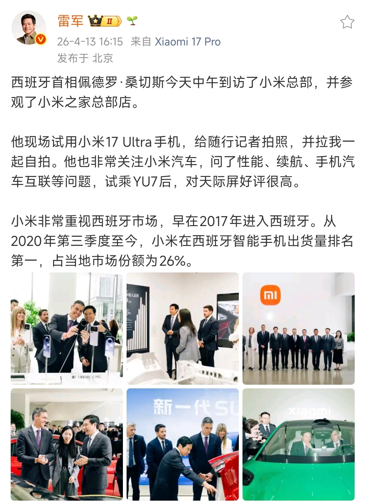 小米在西班牙手机份额达到26%,排名也是数一数二,足以见得当地对小米的认可。西班牙首相这次新SU7和YU7都体验过,相信未来的小米汽车也会在西班牙大放光彩。
