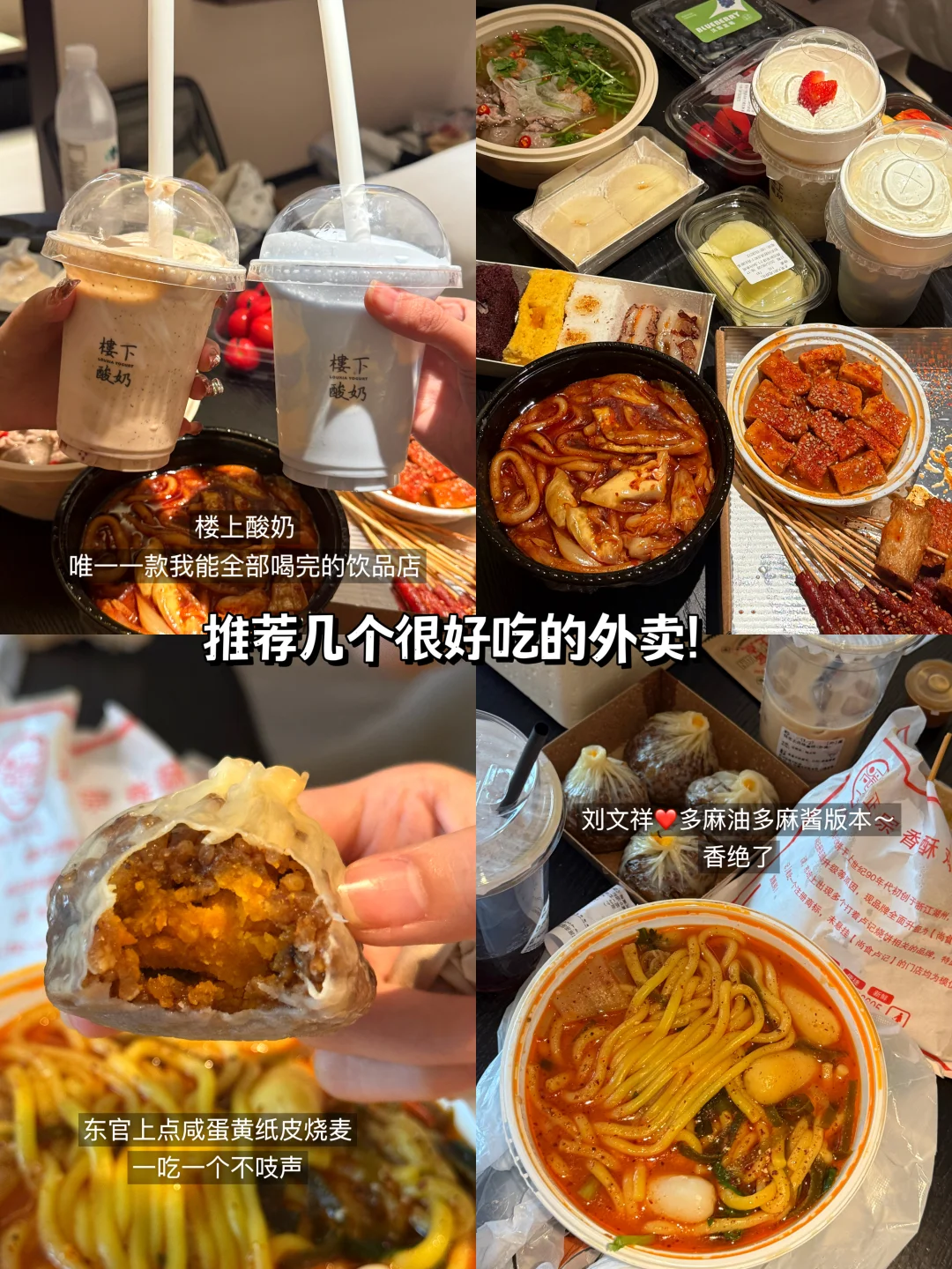 最后一张图给大家放了一些我认为苏州很好吃的外卖!顶楼酸奶还有东官上点的咸蛋黄烧卖是我每次去都要吃的推荐给大家
