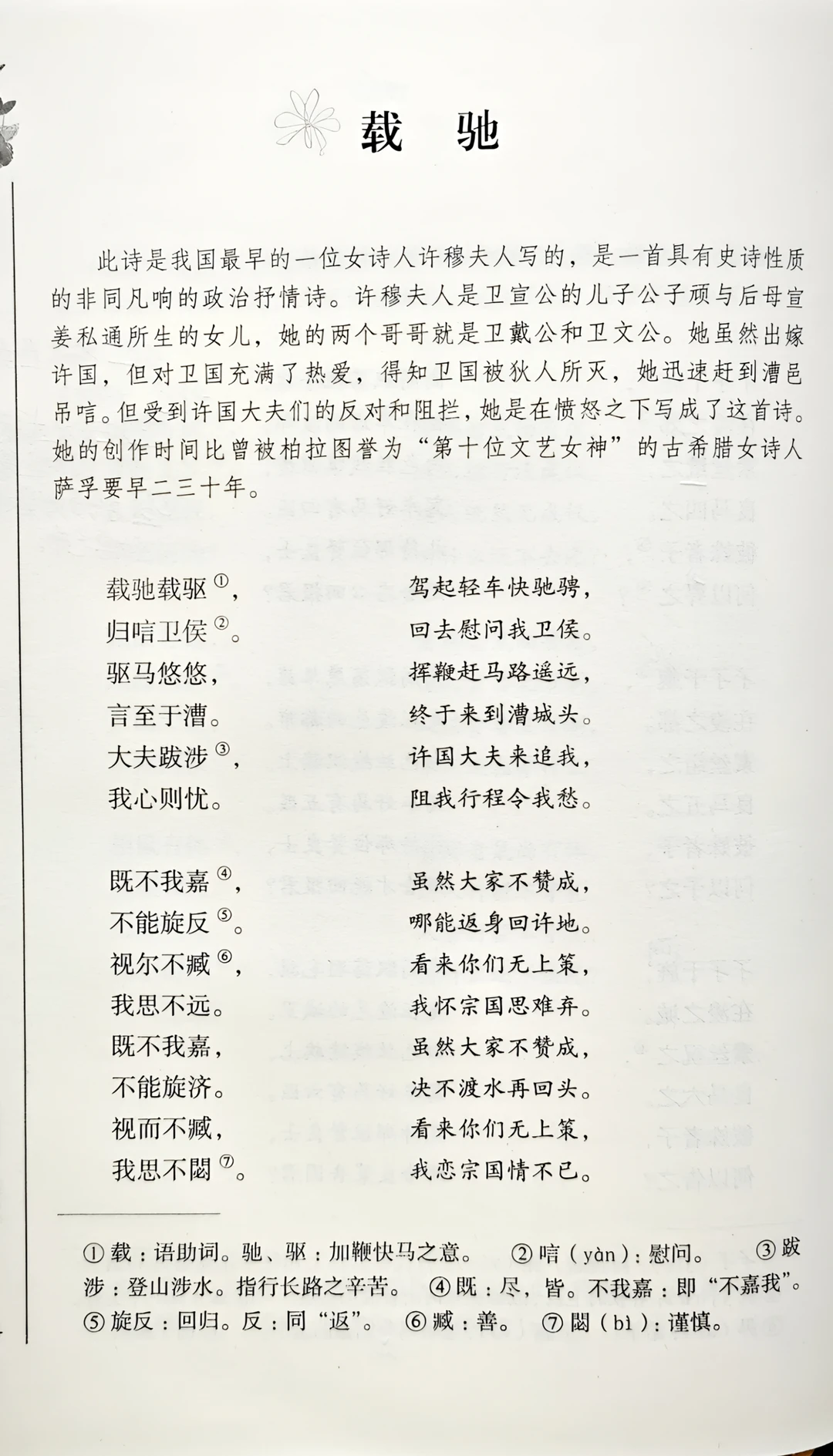 许国大夫一路追赶、阻挡。就在这条奔丧赴难的路上,她含泪落笔,写成了《载驰》。