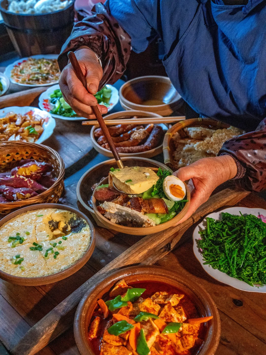 2️⃣ 提前兑换铜板,花铜钱来换小吃挺有意思~可尝尝柴锅饭,老奶奶现烧的锅巴饭浇上农家菜,很有外婆家的味道~