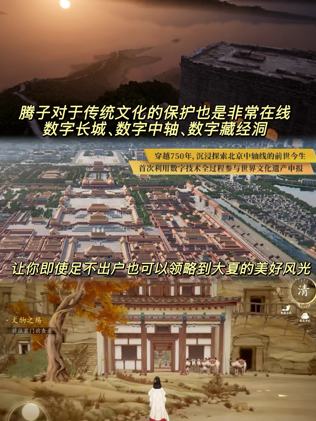 而且不只是游戏里的皮肤和剧情做得有东方韵味,鹅厂还把游戏科技用在了更有意义的地方。数字中轴助力北京中轴线申遗,数字藏经洞高精度复刻16、17窟,数字长城实现超大规模遗产数字化还原…… 用我们年轻人喜欢的方式守护文化遗产,让老祖宗的东西以更鲜活的方式走向世界。