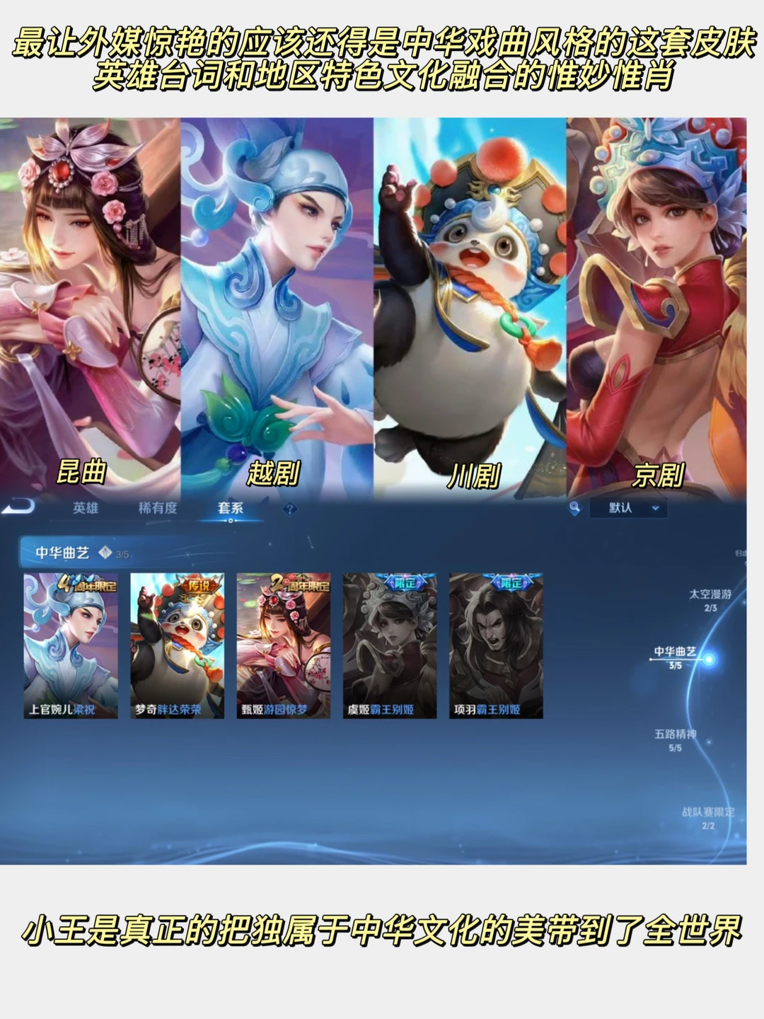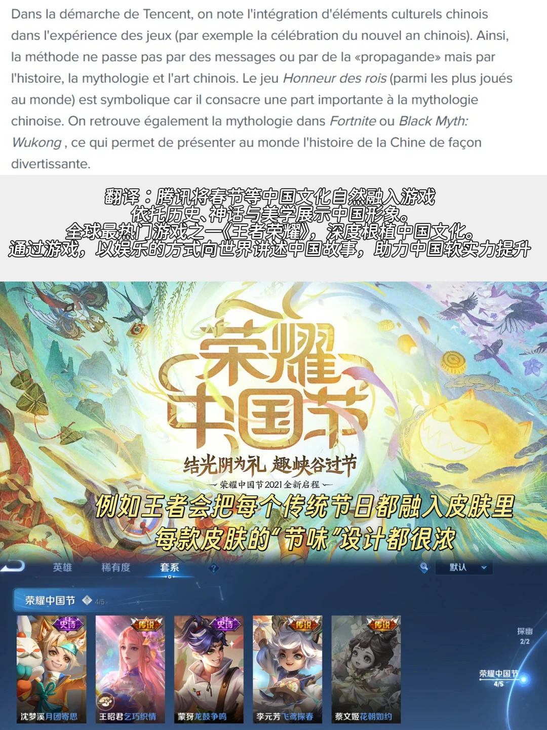 对,就是那个你天天想着上分、想着拥有更多好看皮肤的小王!杨玉环的飞天、上官婉儿的梁祝、大乔的白鹤梁等等,这些皮肤背后都是我们优秀的传统文化,被小王用现代美学的方式展现了出来,按文章里的话来说:它们正在向世界展现一个全新的中国形象!
