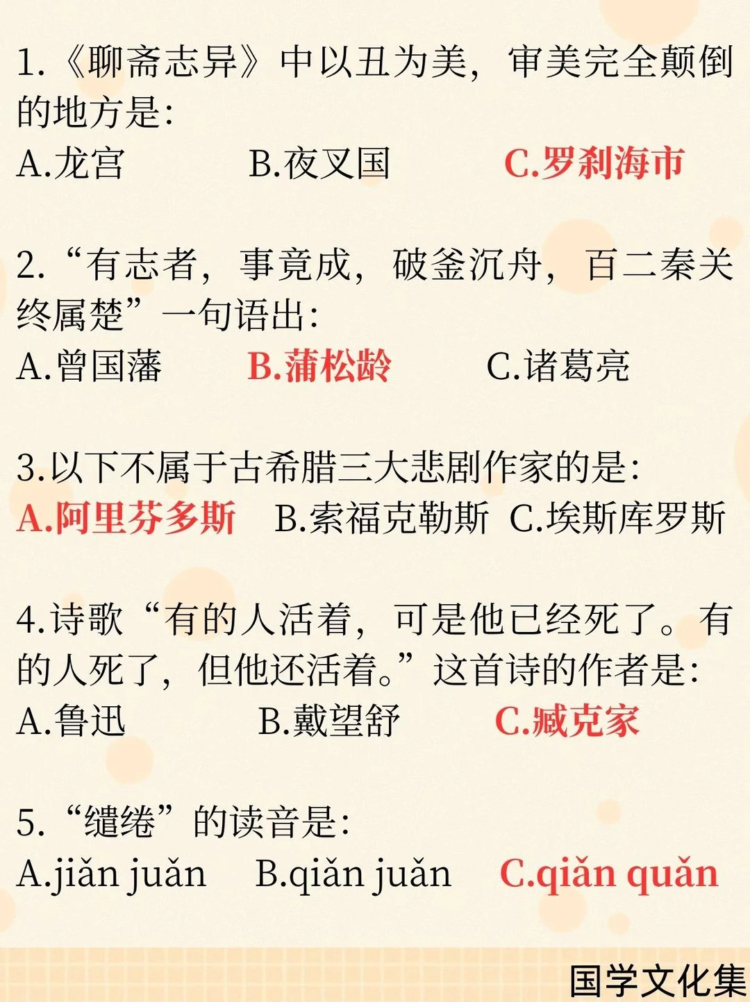 3. 古希腊三大悲剧家:埃斯库罗斯、索福克勒斯、欧里庇得斯;阿里斯托芬不属于。