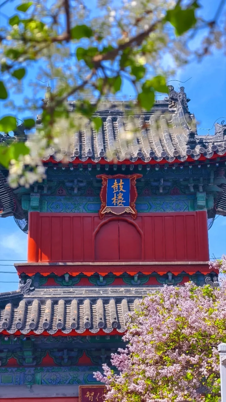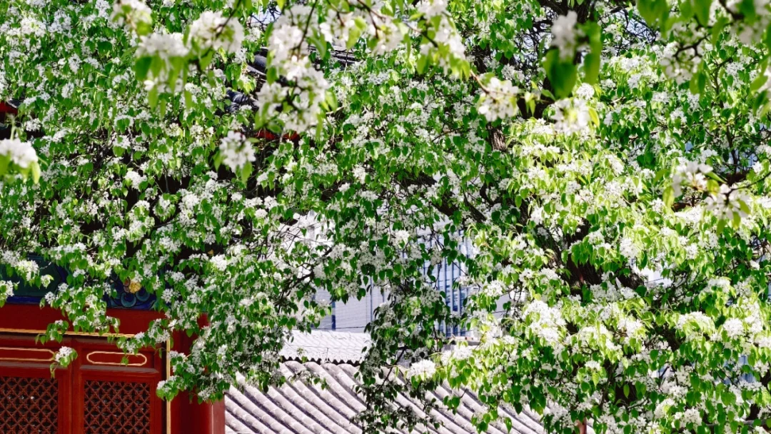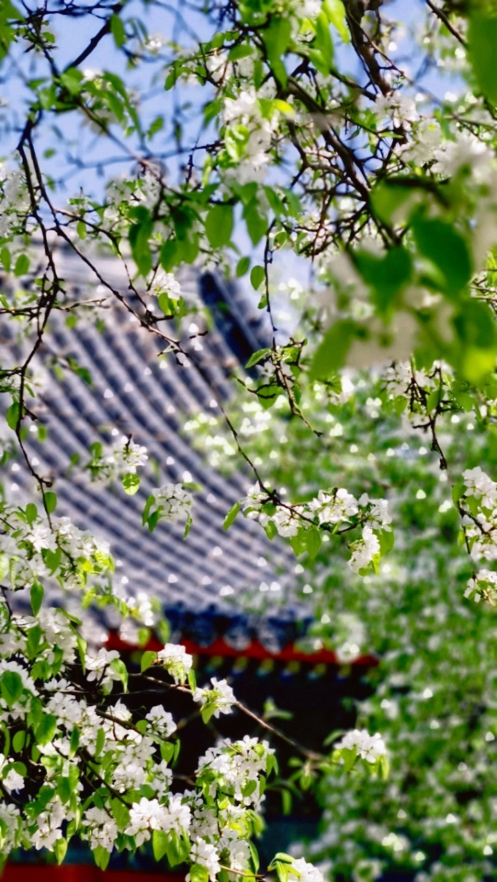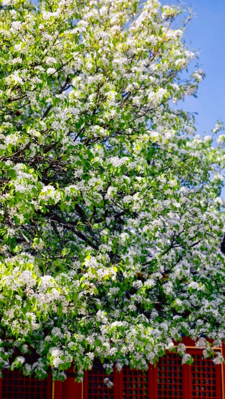 站在梨树下抬头望,纯白的花瓣缀满枝头,在蓝天的映衬下像流动的云,风一吹就簌簌落下,连空气里都飘着清浅的香气。最绝的是透过花枝拍智化殿,蓝底金字的匾额在繁花掩映中,古建的庄重与梨花的灵动完美融合,随手一拍就是氛围感大片。