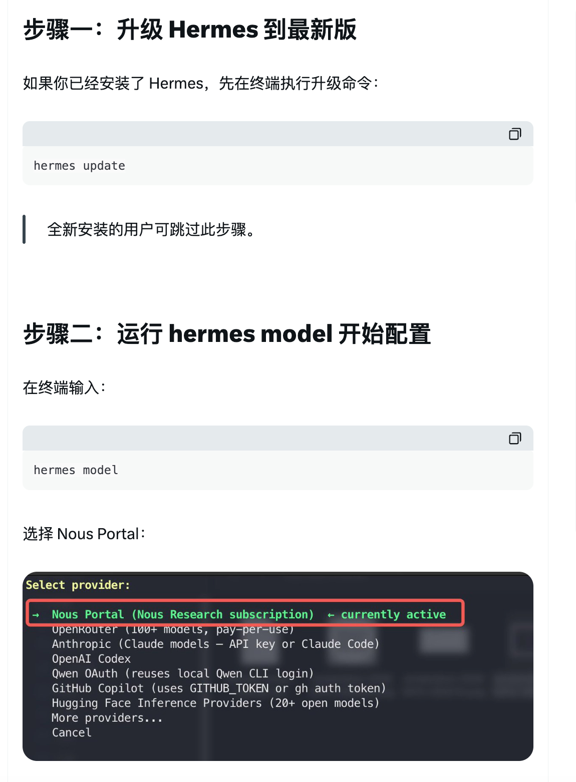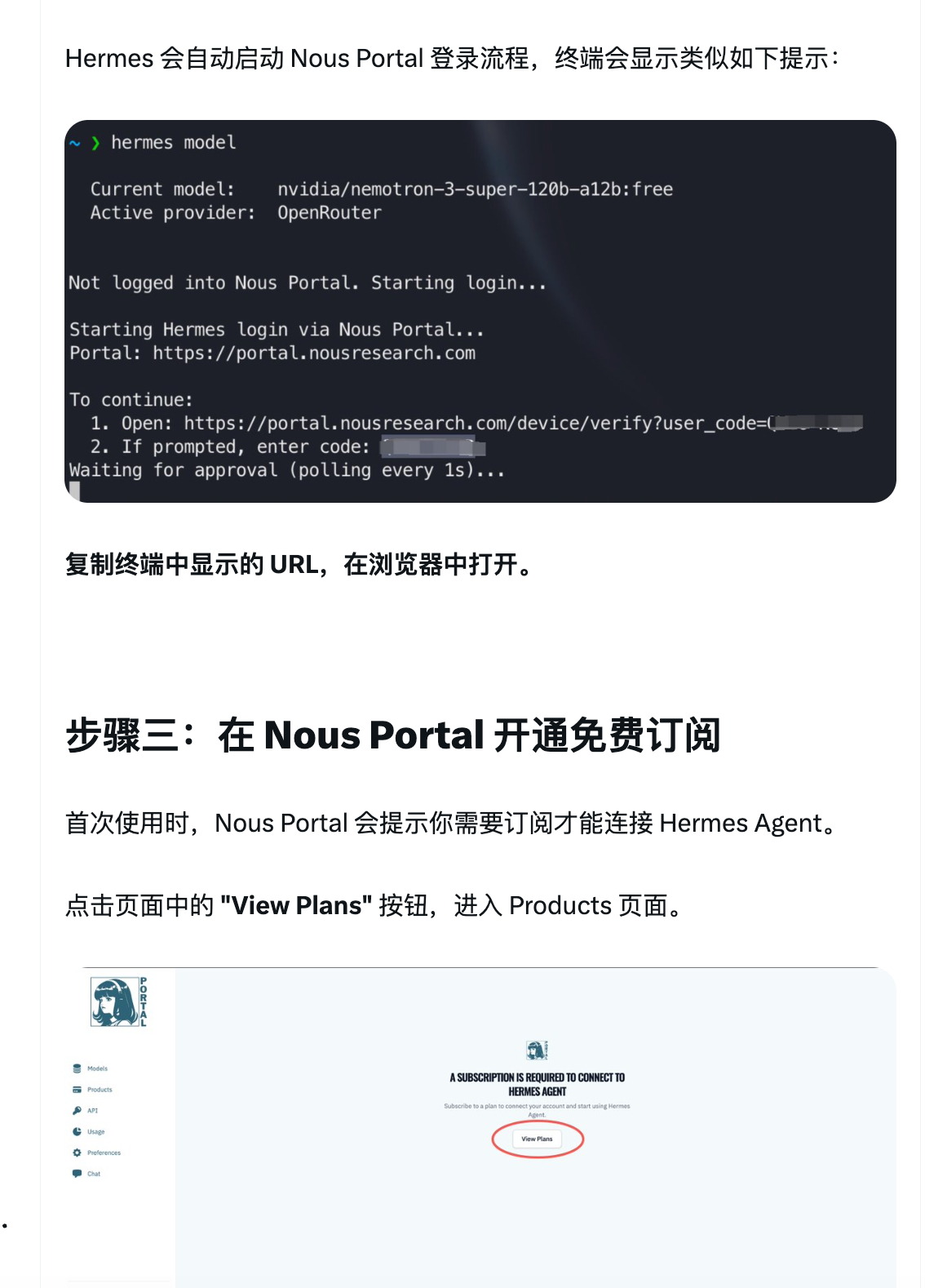 1、安装或升级 Hermes 到最新2、在终端里执行命令:hermes model,选择第一个 Nous Portal !!!3、进到终端返回的订阅页面去订阅,点击左侧的 Products,进到套餐选择页面,选择 Free 套餐订阅4、授权5、在终端选择模型,搞定