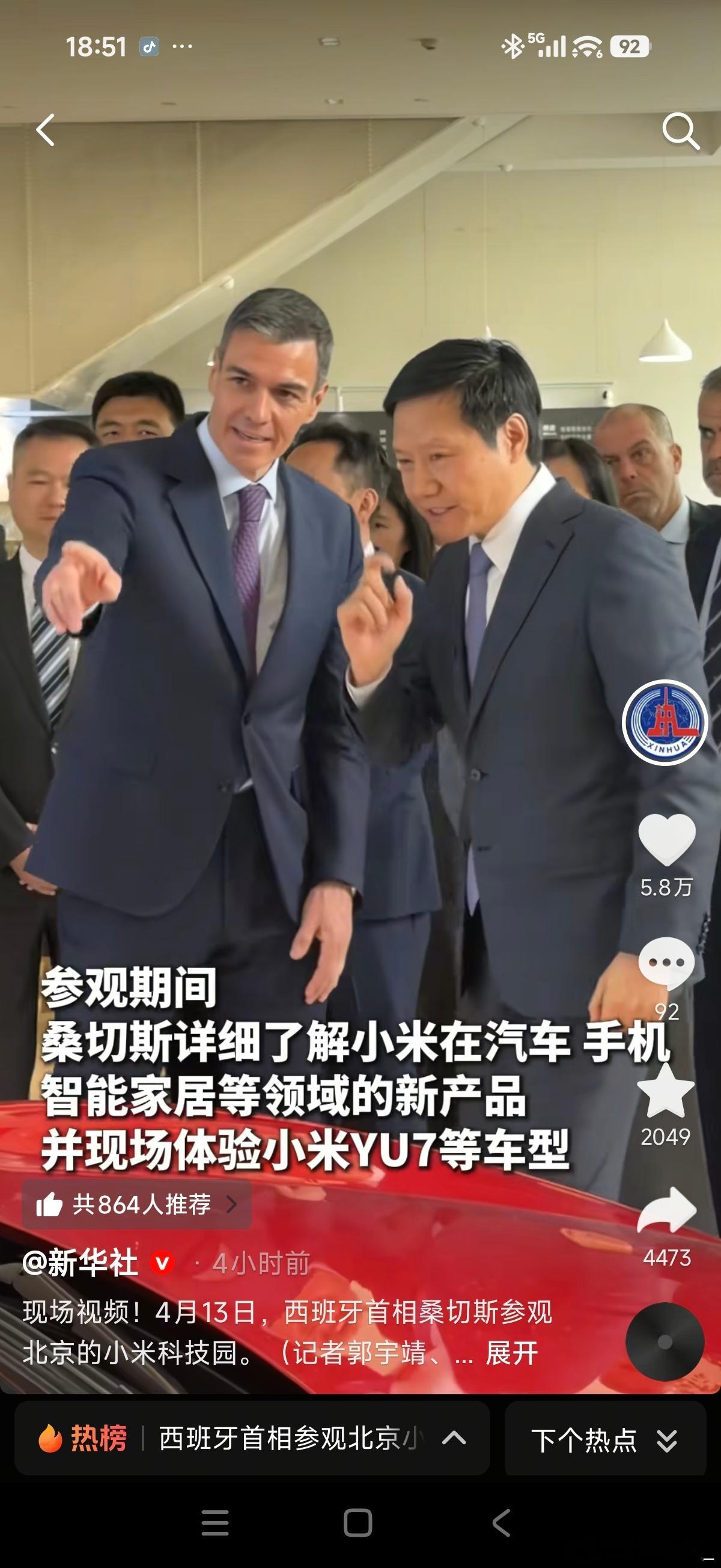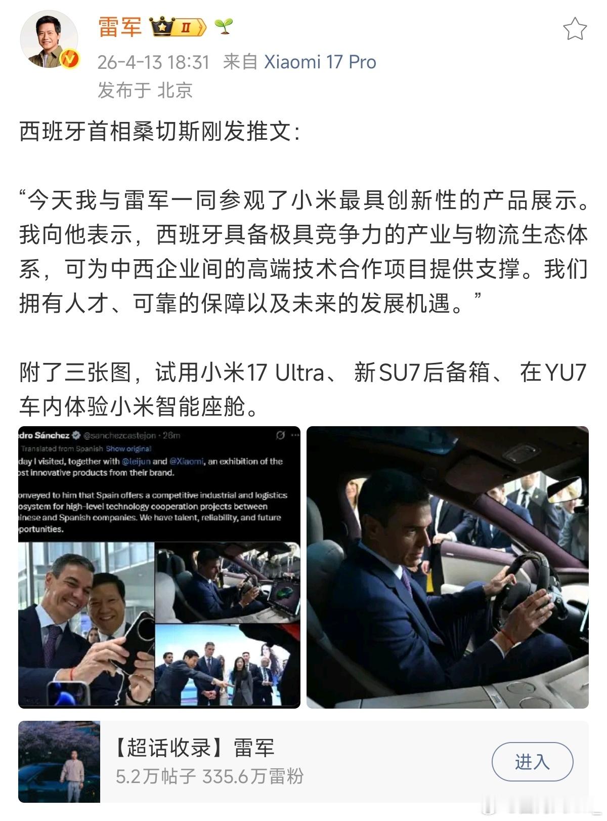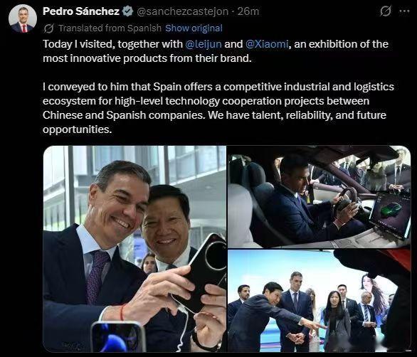 小米在西班牙的一路深耕,就是中国品牌高质量出海最好的写照。手机已经在欧洲站稳了脚跟,凭小米汽车现在的质量、口碑、销量底子,在西欧火起来也是必然的。西班牙首相访华西班牙首相参观小米