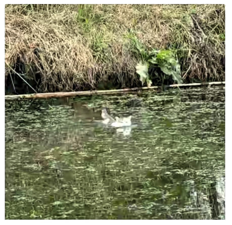 看这图水草挺多的,猫猫真勇敢,不怕被缠住。