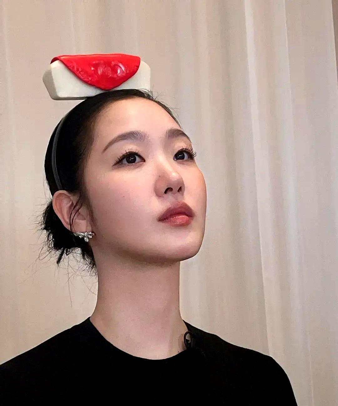 她在个人社交账号晒出两张日常自拍。穿黑色高领衬得脸部线条利落,这款搞怪头饰上的三文鱼纹理清晰可见,对着镜头眨眼后低头刷手机,全程状态松弛不刻意。