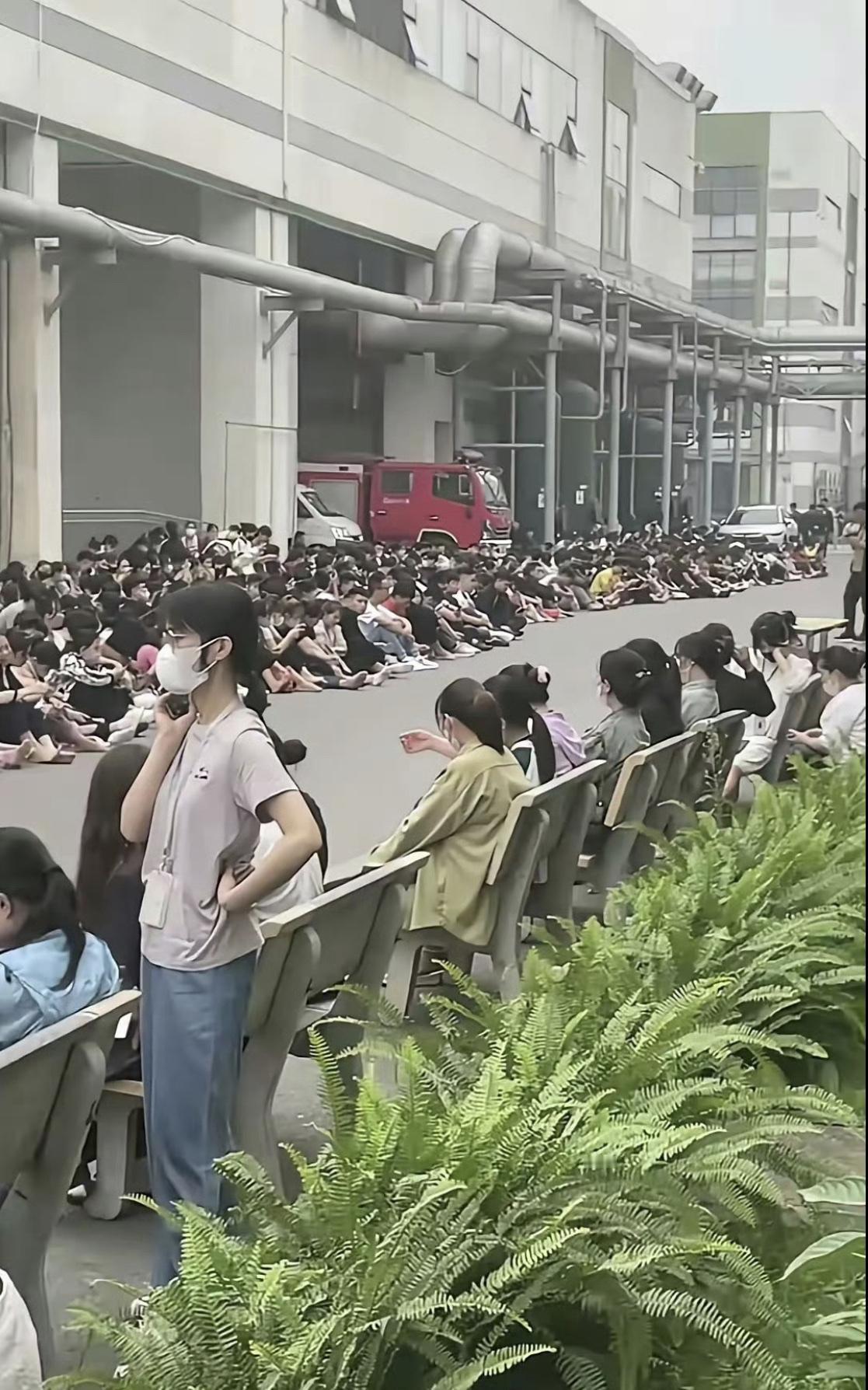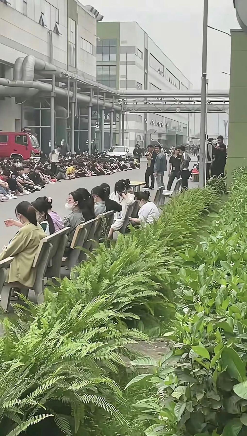 越南的工厂又停电了,年轻的工人们只能在工厂外一排排坐着等待恢复通电,好继续打工挣