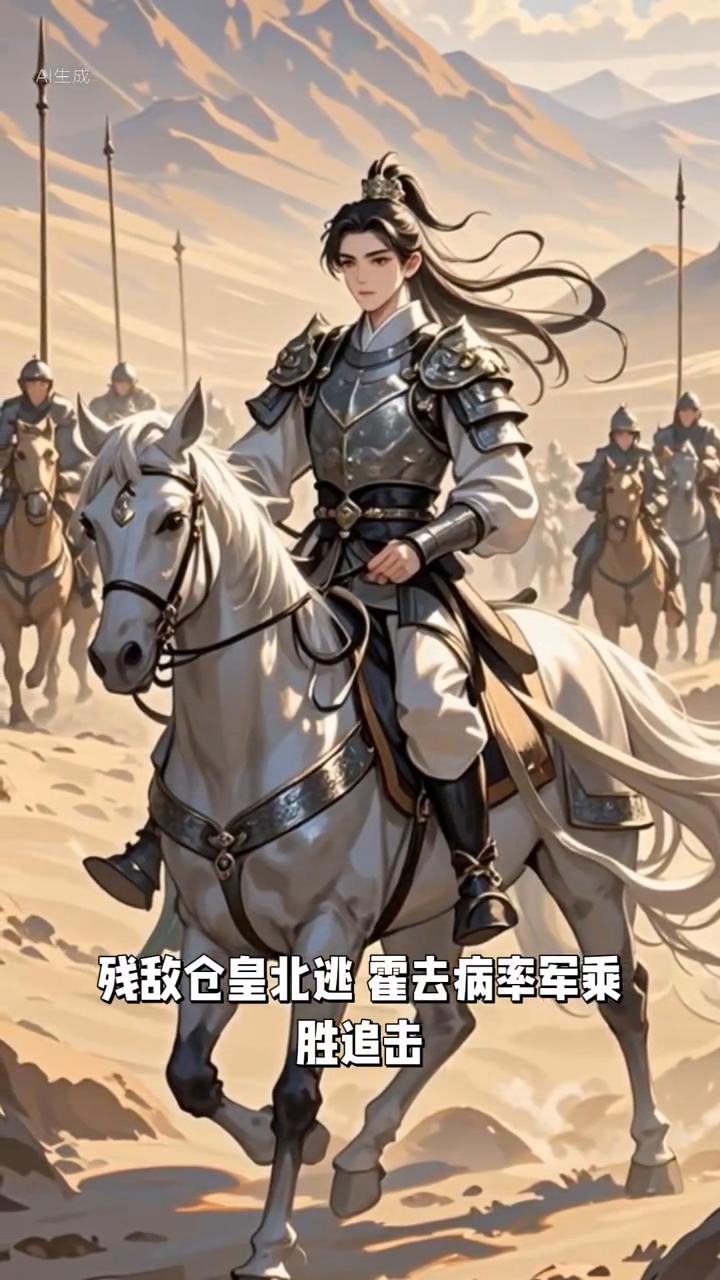 面对数倍于己的匈奴骑兵少年将军毫无惧色,身披铠甲,手持长枪,一马当先冲入敌阵。汉军将士受其鼓舞,个个奋勇争先,长刀所向,杀声震天。霍去病指挥若定,凭借灵活的骑兵战术直击匈奴要害,大破敌军阵营,斩杀敌军七万余人,生擒匈奴屯头王、韩王等三位王爷,俘获将军、相国等八十三名重残敌仓皇北逃。