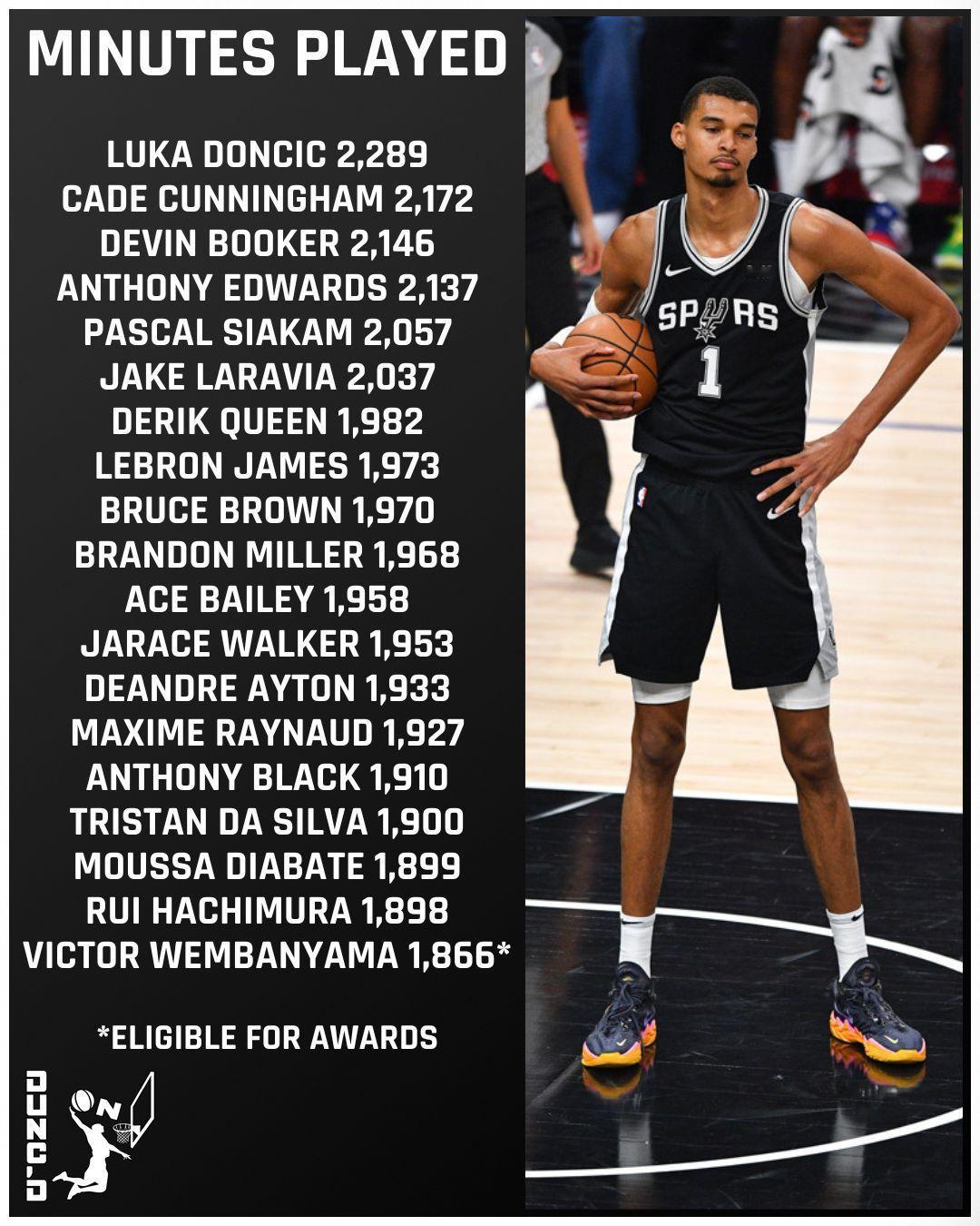 美媒Nate Duncan分享数据:文班亚马出战65场,打了1866分钟,本赛季