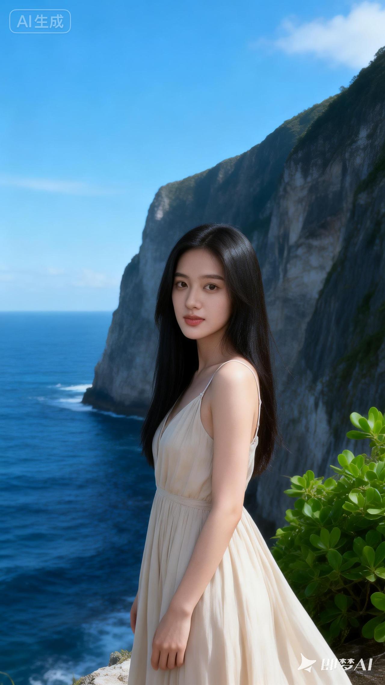 悬崖边的少女,海风轻拂,裙摆飘逸,如梦如幻。