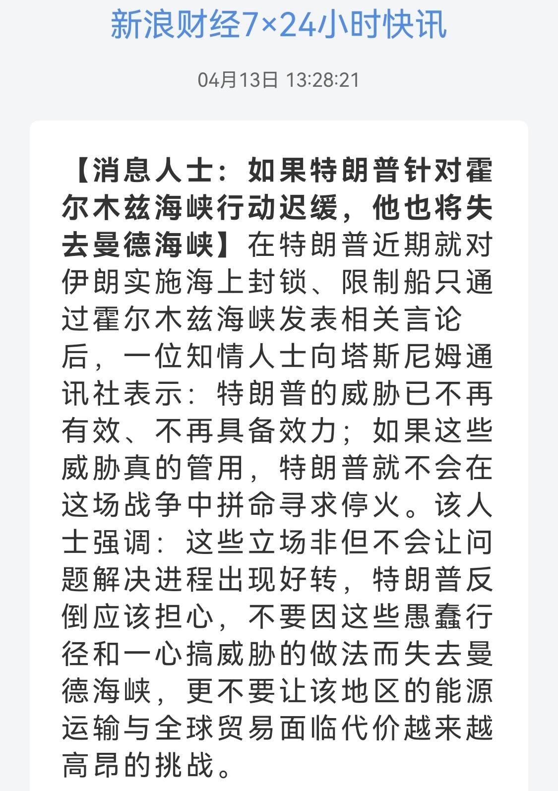 就像知情人士所说,特朗普的威胁已不再有效、不再具备效力;如果这些威胁真的管用,特朗普就不会在这场战争中拼命寻求停火。这些立场非但不会让问题解决进程出现好转,特朗普反倒应该担心,不要因这些愚蠢行径和一心搞威胁的做法而失去曼德海峡,更不要让该地区的能源运输与全球贸易面临代价越来越高昂的挑战。