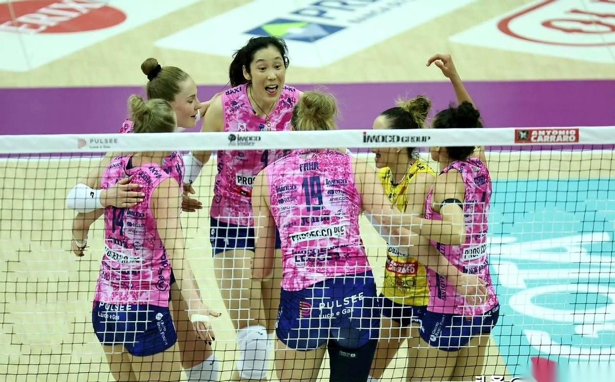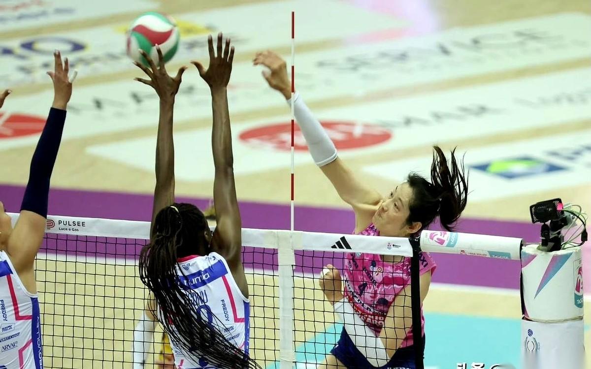 米兰队的战术眼看就要彻底奏效了。但就在对面的头号重炮手埃格努高高跃起,准备痛快下分的时候,迎接她的,是网前两只结结实实的手掌。
