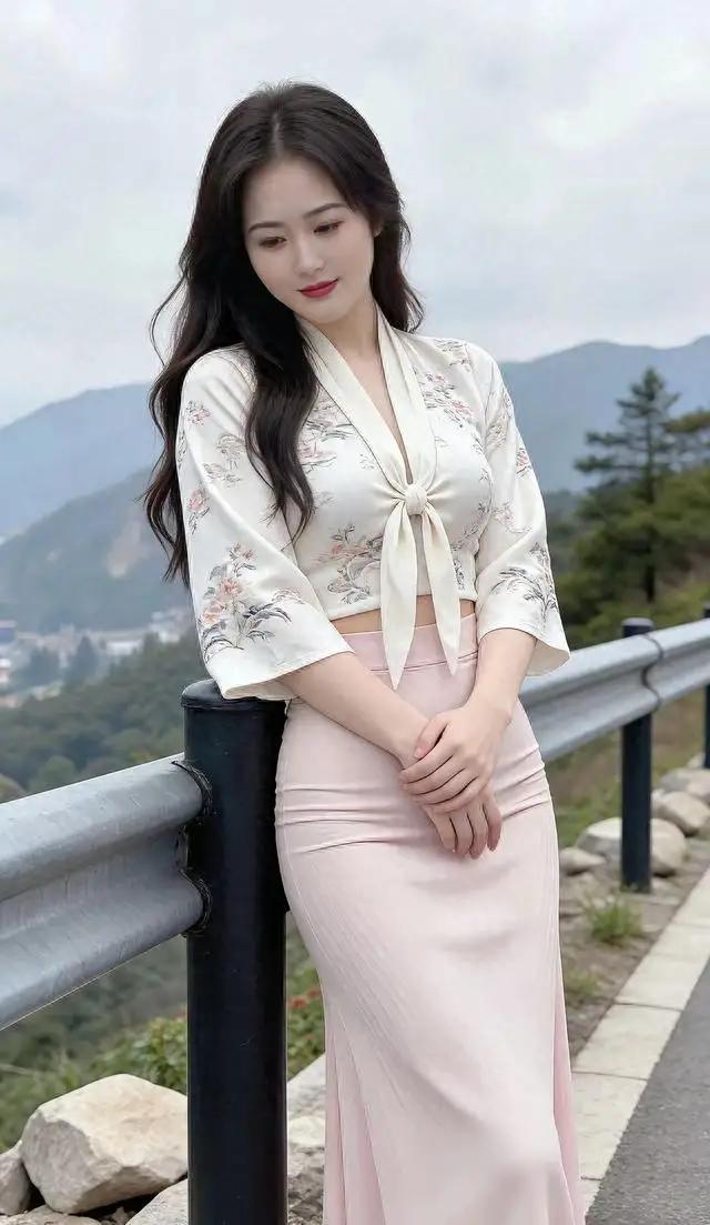 在山间小路上,优雅地倚靠栏杆,感受自然的宁静与美好。