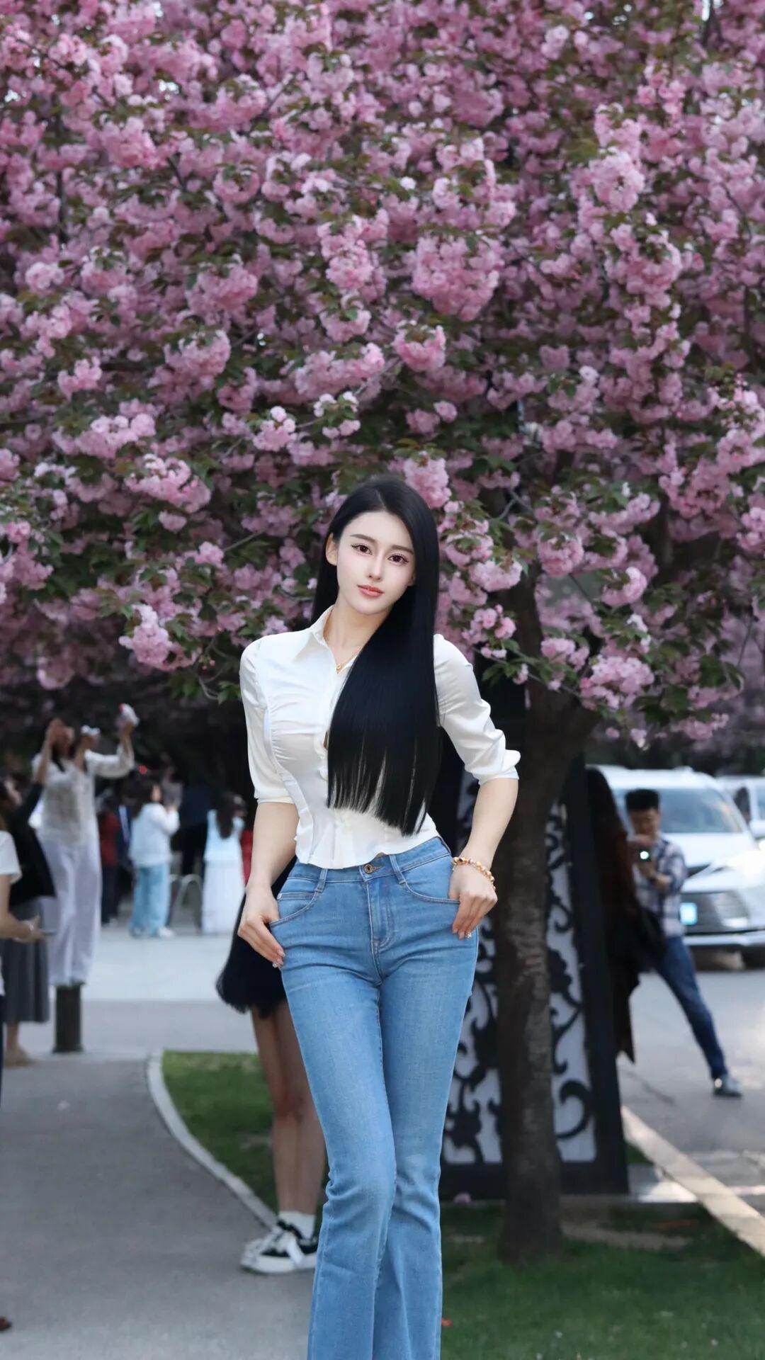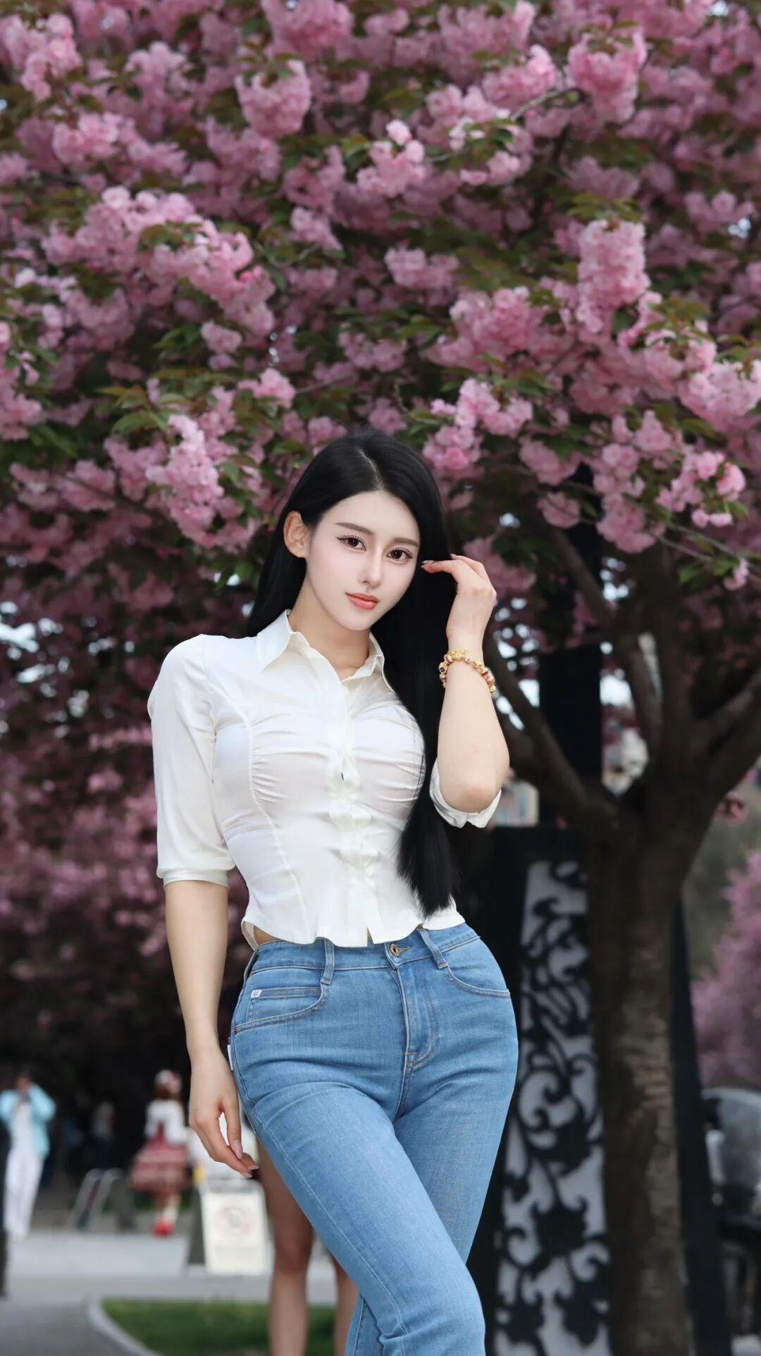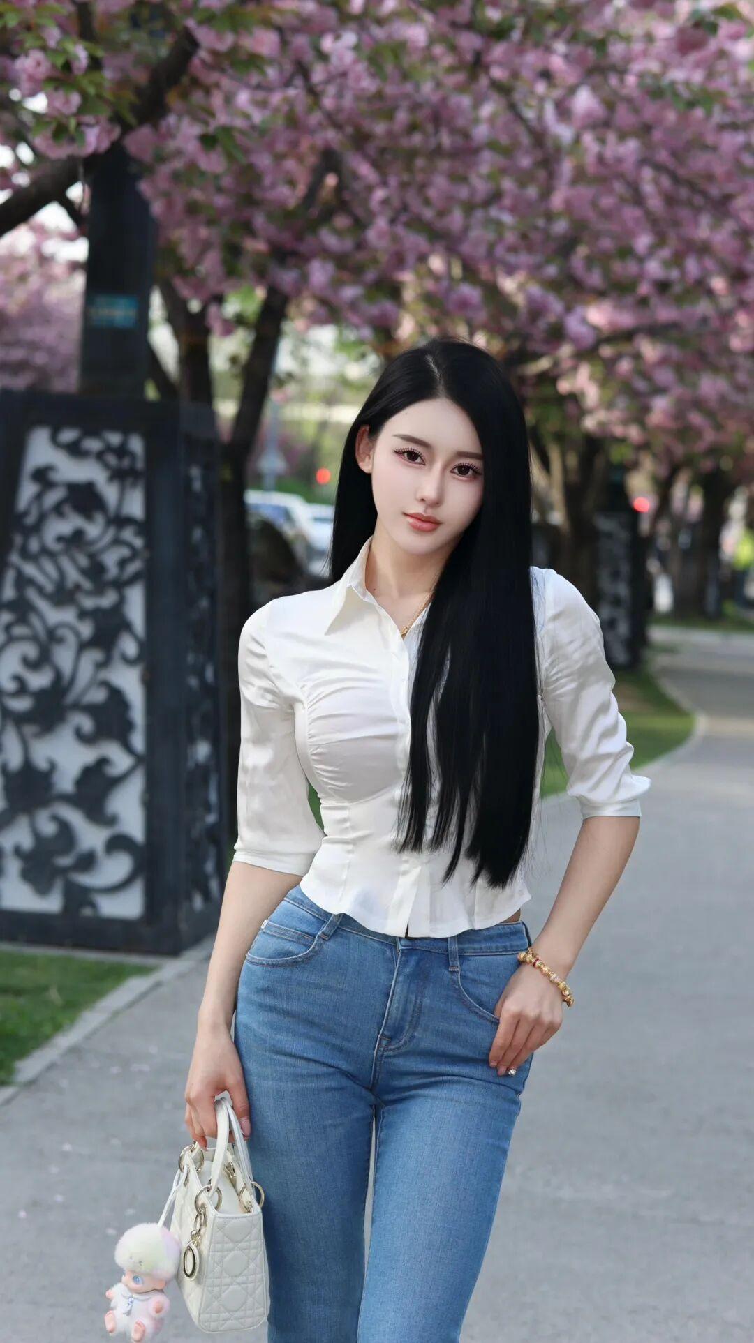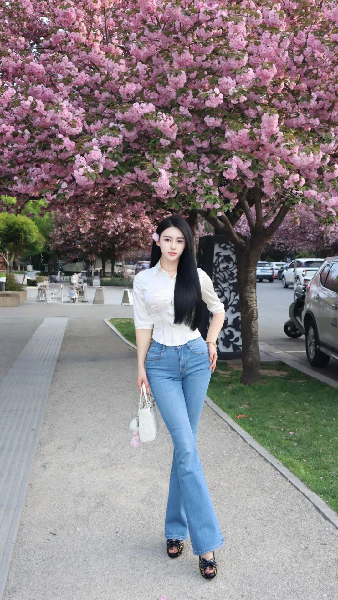 上身穿着简约修身的白色翻领中袖衬衫,褶皱收腰设计完美勾勒曼妙身形,干净又知性;下身搭配高腰浅蓝色微喇牛仔裤,极致拉长腿部线条,利落又显身材,简约白蓝配色清爽高级。