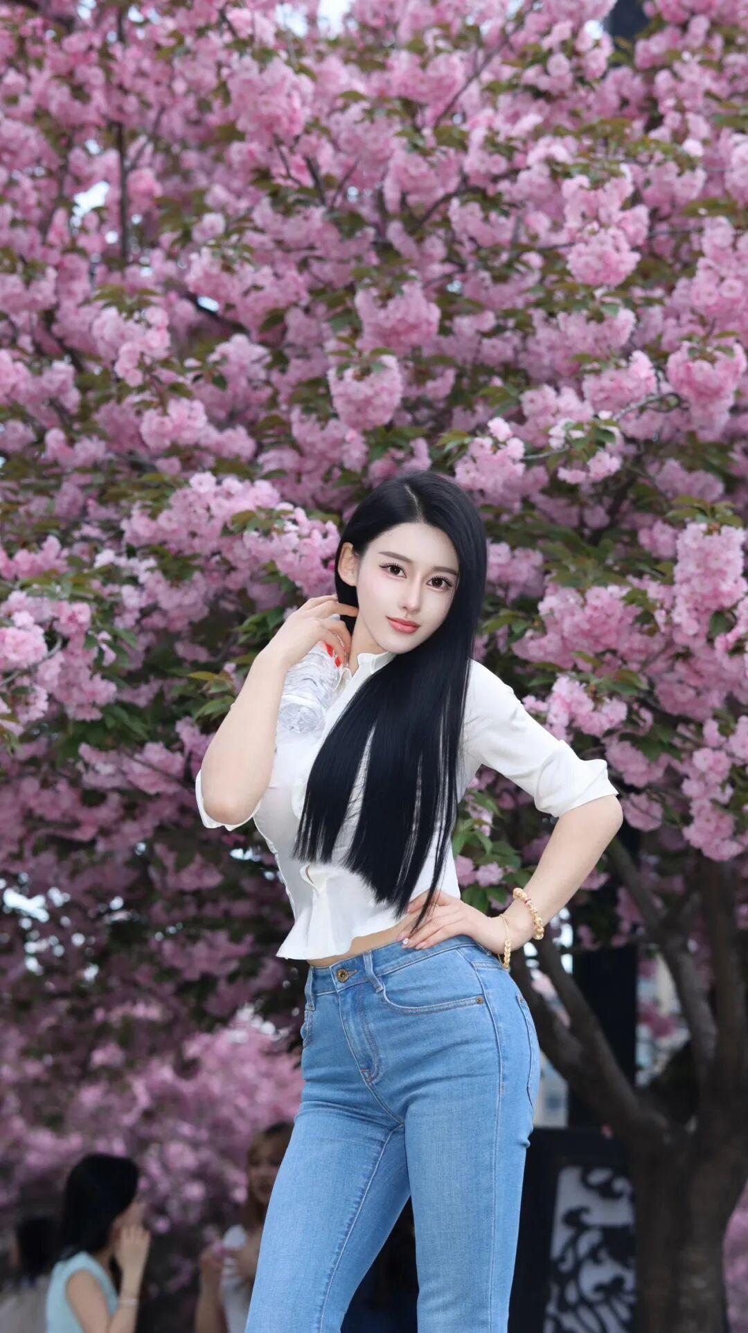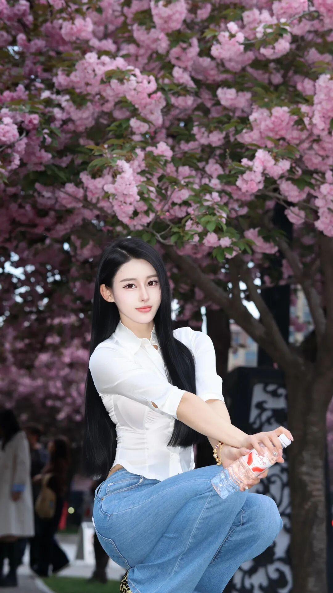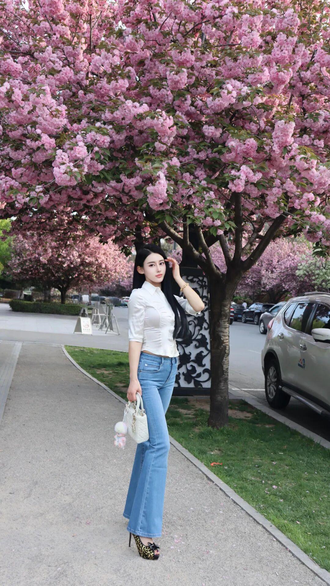 手腕点缀精致金饰,搭配小巧精致的白色手提包,细节温柔精致。置身于漫天盛放的粉樱花海之间,一颦一笑温婉动人,身姿窈窕曼妙,春日浪漫氛围感拉满,清冷又甜美的气质和粉樱美景完美相融,温柔又惊艳。