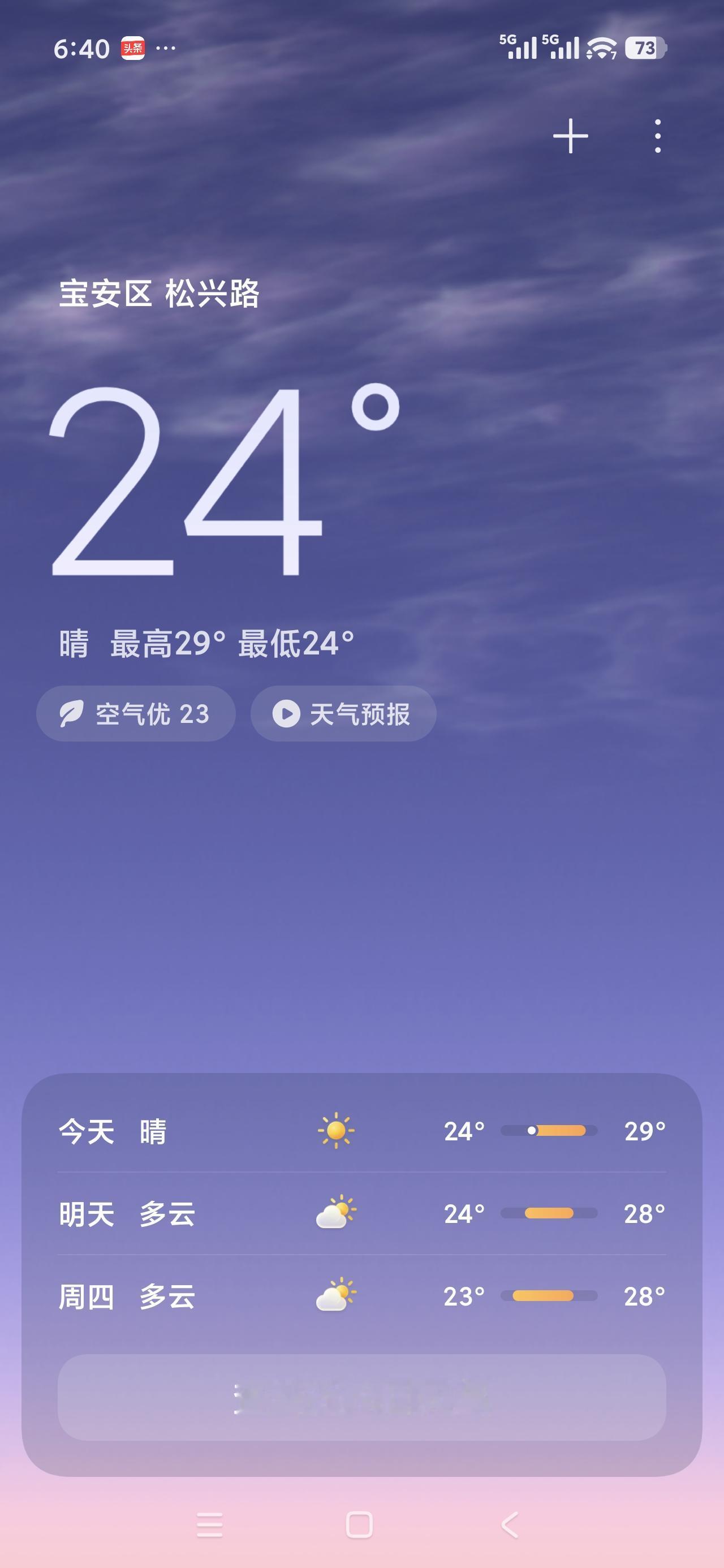 我这里的天气:☀️晴天:深圳今日晴天,气温24度到29度,湿度85度,大家早上好,周二快乐!