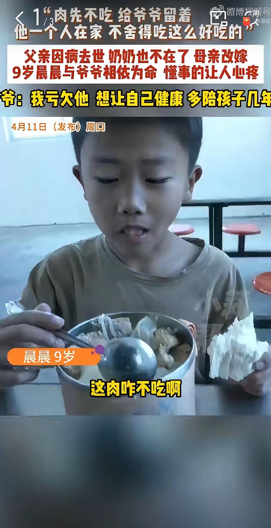 事情发生在河南周口一所乡村小学。那天中午食堂开饭,别的孩子盯着餐盘里的红烧肉眼睛都亮了,晨晨却悄悄把肉块拨到一边,趁周围人不注意,用纸巾裹好塞进书包最里层,自己扒拉着青菜米饭吃得很香。这已经不是第一次了。班主任李老师留心观察了一个多星期,发现这孩子顿顿如此——米饭青菜吃得干干净净,肉永远不动,像在完成某种秘密仪式。老师忍不住走过去问他:“晨晨,你怎么不吃肉呀?”晨晨低着头,手指绞着衣角,声音小得几乎听不见:“肉给爷爷留着带回去吃。”老师再追问,孩子眼圈一下子就红了:“我爸爸去世了,奶奶也去世了……我怕爷爷也没了。爷爷平时都舍不得吃这么好吃的东西,我想让他尝尝。”