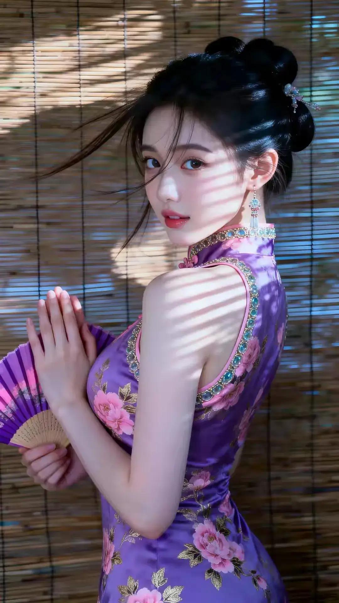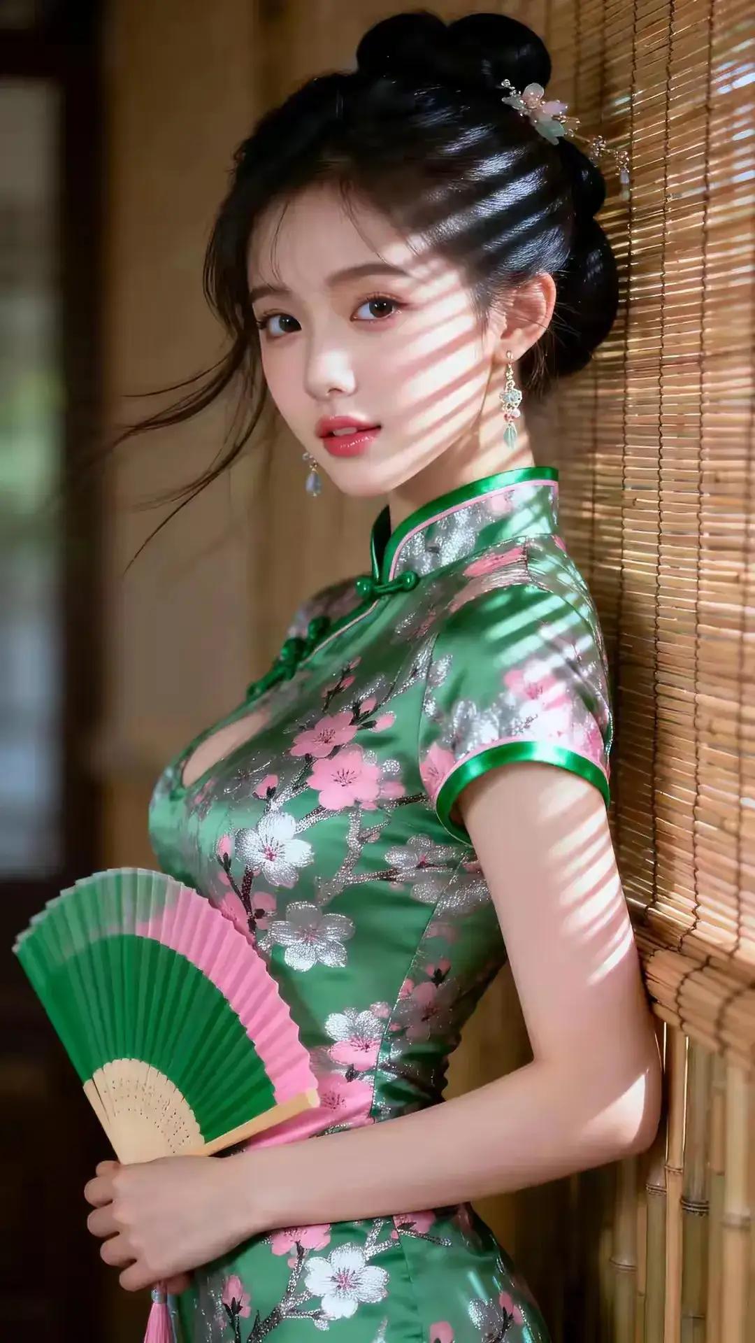 修身旗袍版型完美勾勒曼妙窈窕身姿,搭配古风耳饰、折扇、精致发簪,竹帘光影氛围感拉满。把中式旗袍独有的含蓄温柔、东方韵味与极致曼妙性感完美融合,古典温婉里藏着入骨风情,每一帧都清冷又惊艳。