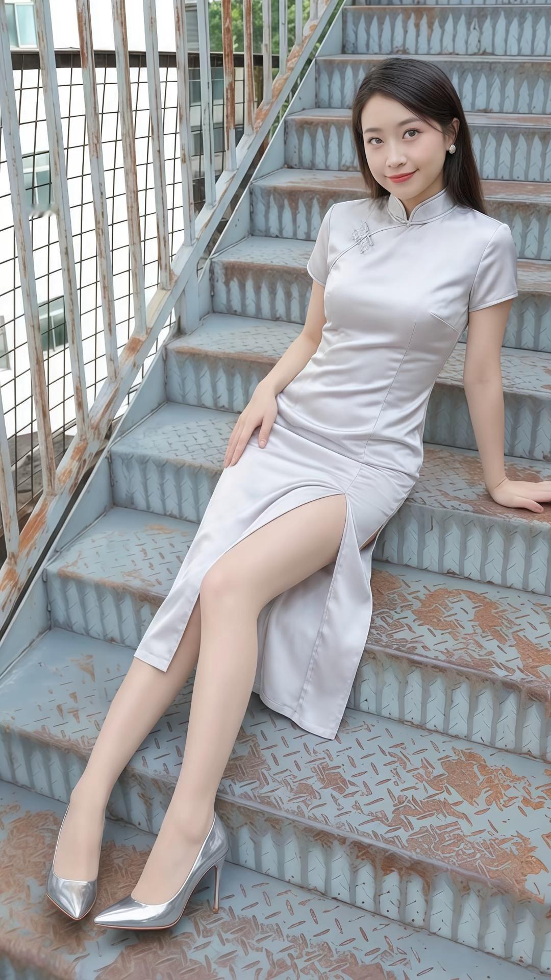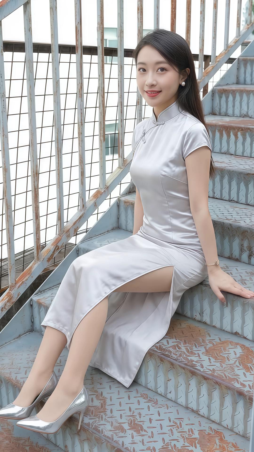 搭配同色系银色尖头细跟高跟鞋、简约珍珠耳饰与细手链,精致低调又贵气。工业风楼梯场景里,清冷简约的版型把东方温婉雅致拿捏得恰到好处,温柔端庄又自带内敛高级的氛围感,清雅又耐看。