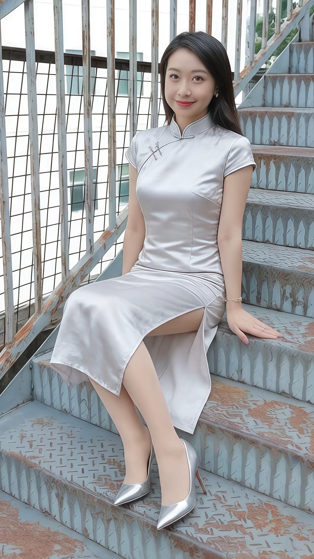 一身银灰色缎面极简旗袍,光泽感丝滑面料高级又大气,精致立领+侧边水钻盘扣细节雅致,修身剪裁完美勾勒曼妙匀称的身形,侧边高开叉设计含蓄又灵动,恰到好处展露纤细腿部线条。